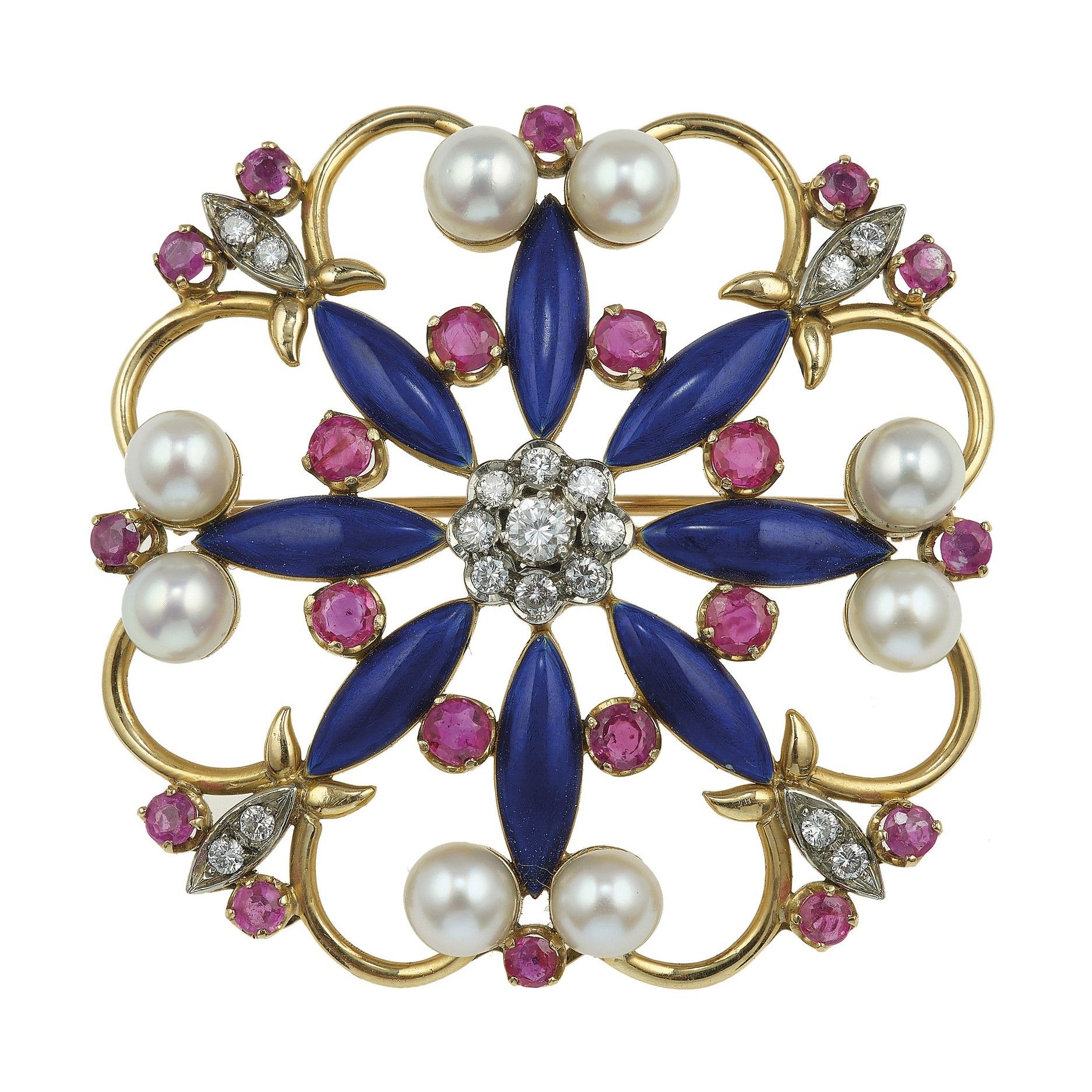 Spilla con rubini, perle, diamanti e smalto