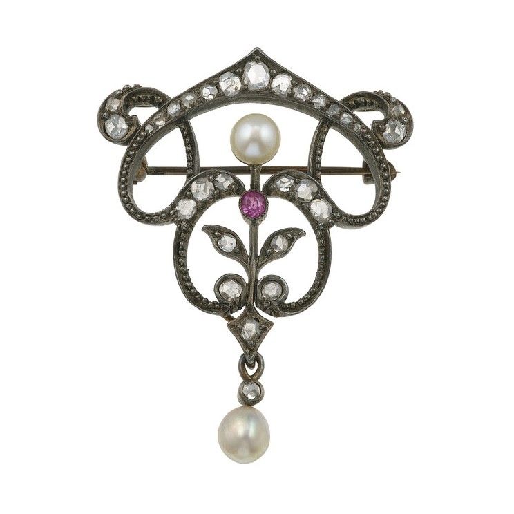 Spilla/pendente con rubino, perle e diamanti taglio rosa