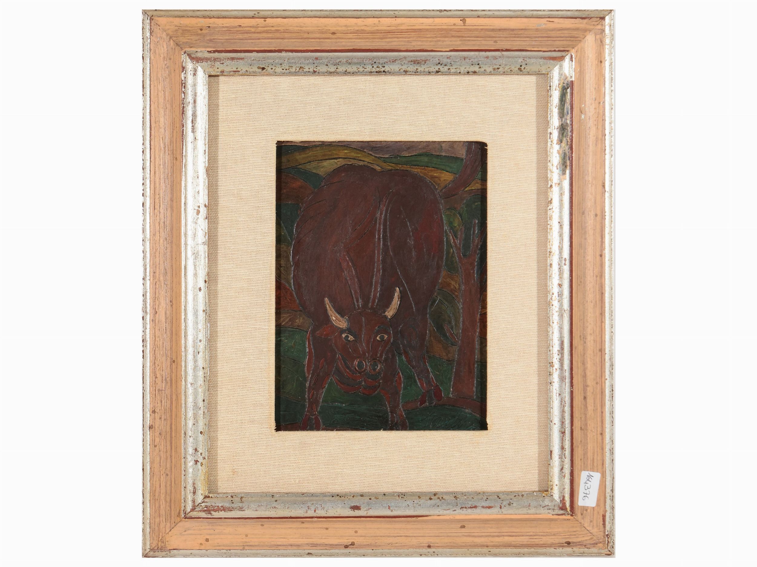 olio inciso su cartone, firmato, in cornice