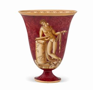 cm 29X16X34 Vaso a campana schiacciata su alto piede in terracotta maiolicata con decori a seppia di personaggio [..]