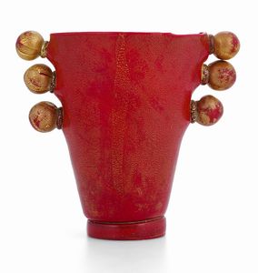 Alt. 37 cm Vaso globulare schiacciato in terracotta maiolicata con piede troncoconico e collo ad anello con decoro [..]