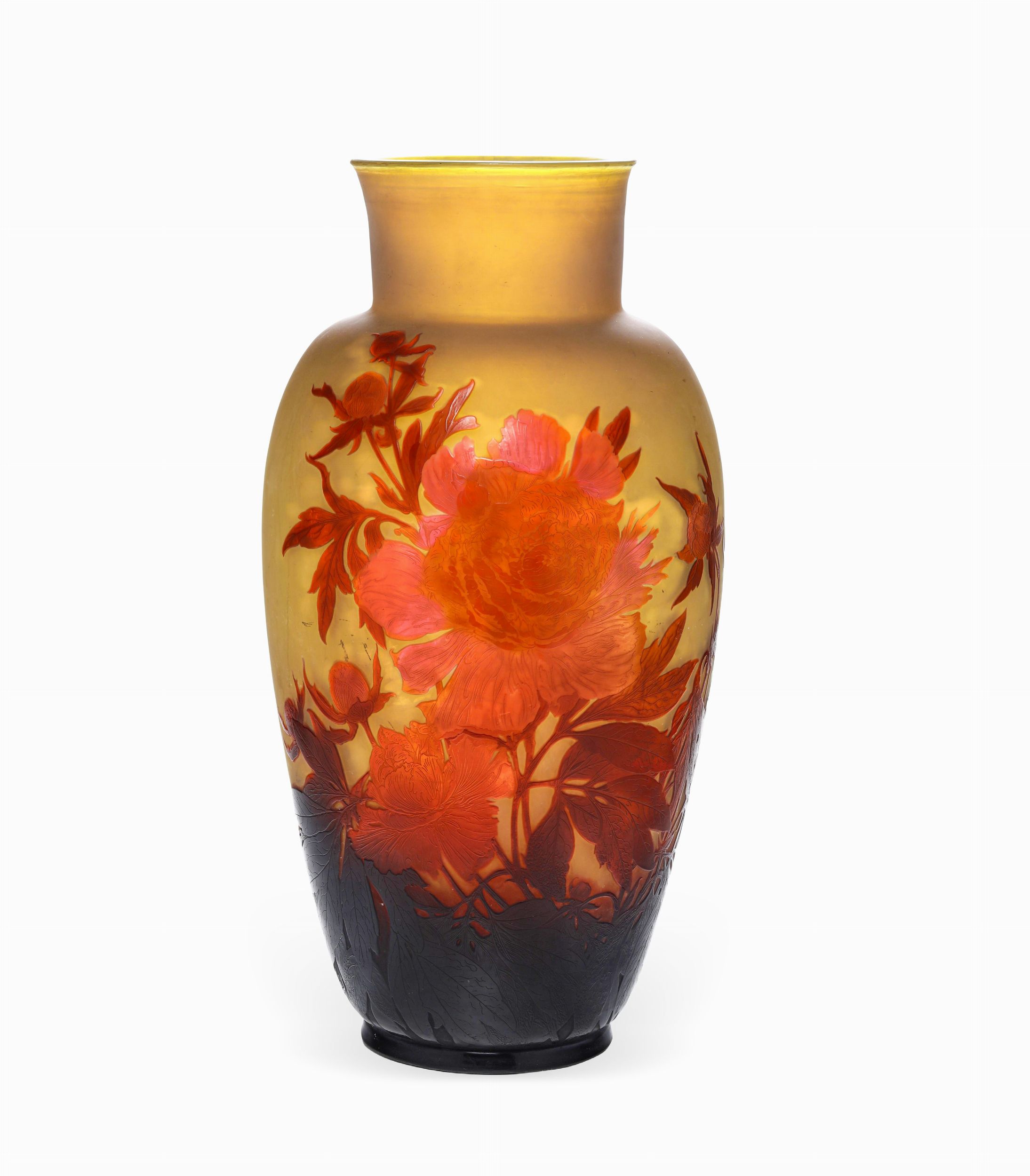 Grande vaso a balaustro in vetro a cammeo con decoro di peonie. Firma a rilievo.