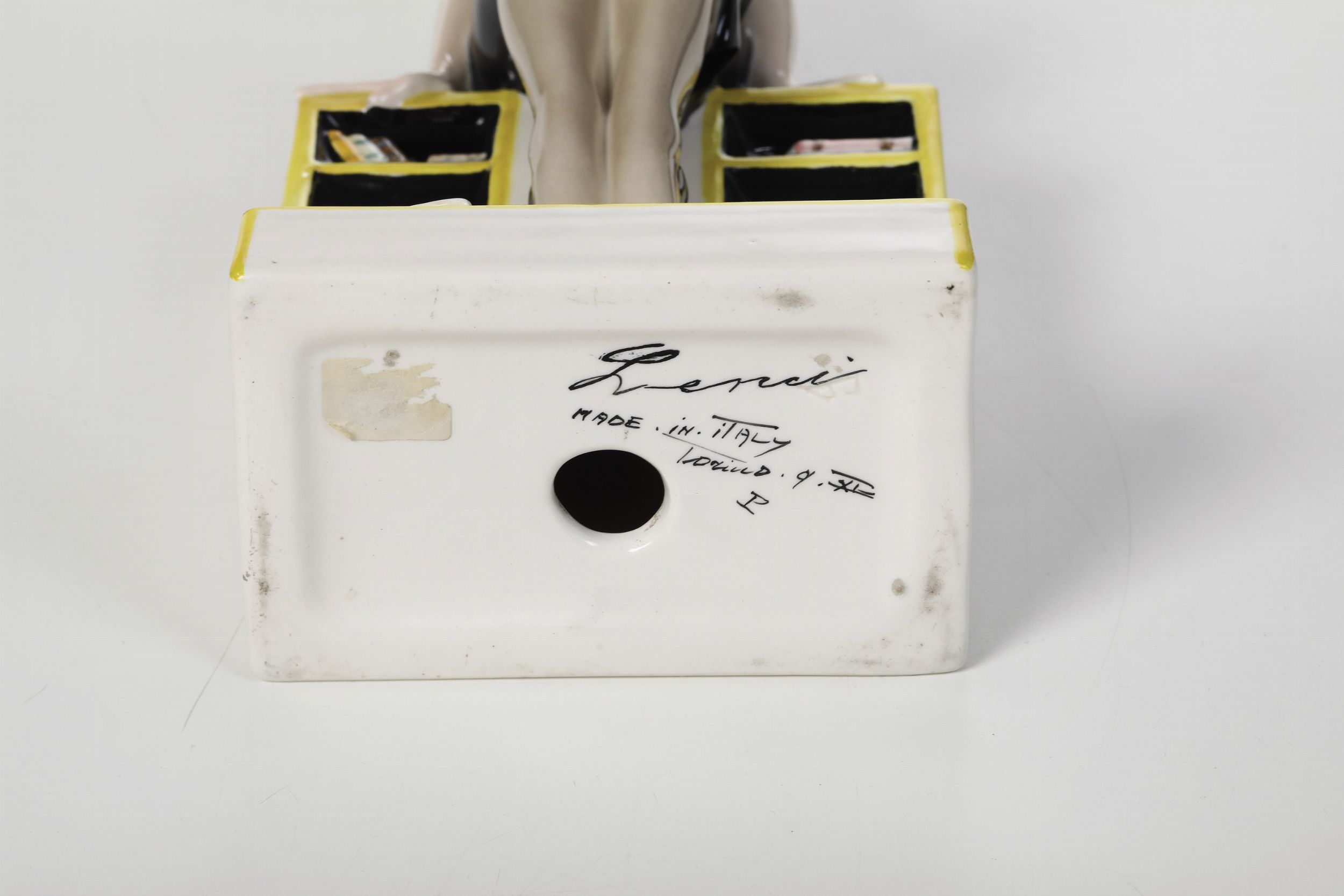 Figura raffigurante ragazza con cappello e grande foulard seduta su libreria in terraglia a colaggio con decoro policromo. Marchio della manifattura e data alla base.