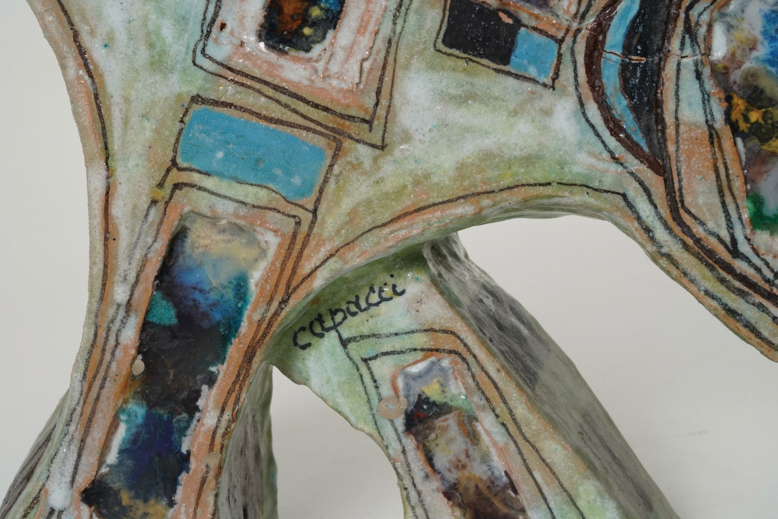 Placca raffigurante gatto stilizzato in terracotta maiolicata con decoro astratto [..]