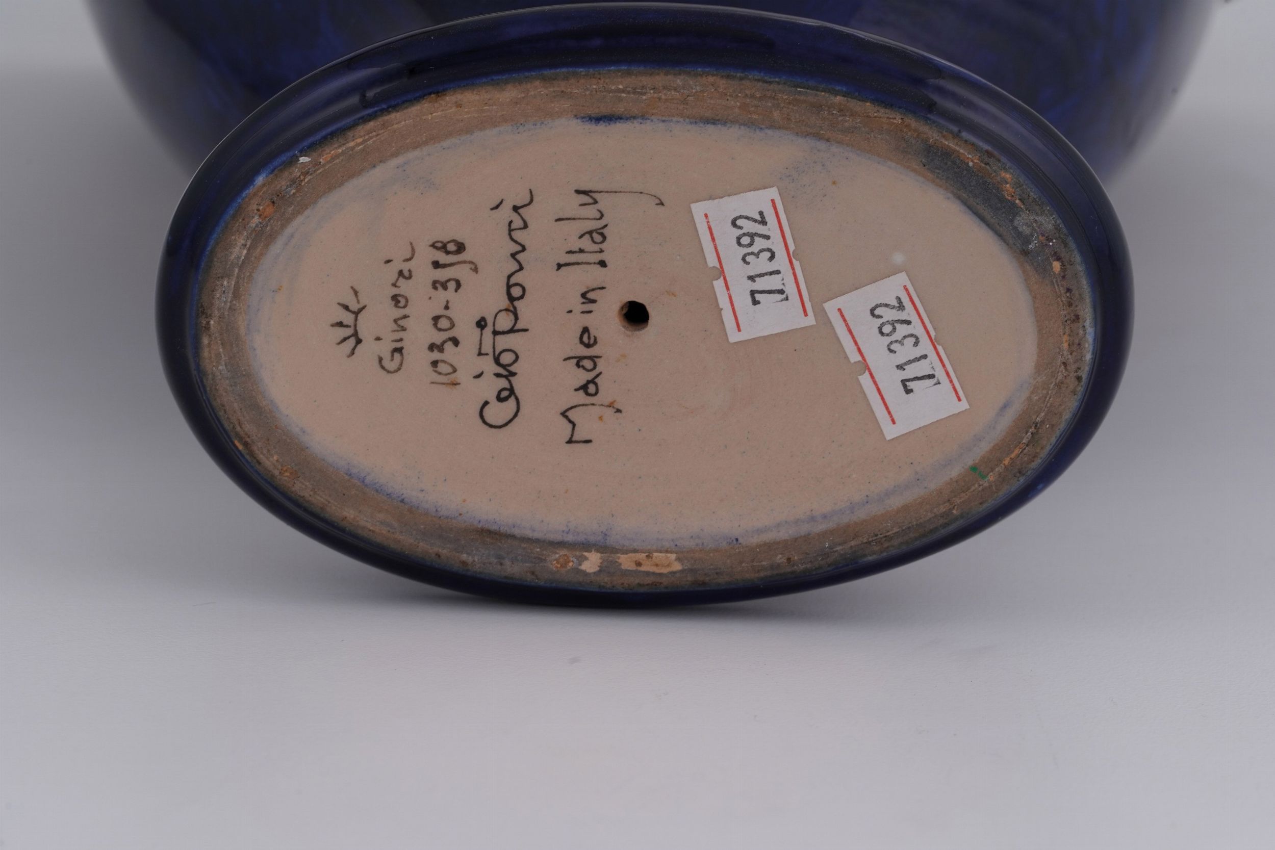 cm 26X16X34,5 Vaso serie Venatoria a campana schiacciata su alto piede in terracotta maiolicata con decoro a seppia su fondo blu. Marchio della manifattura e firma dell'autore.