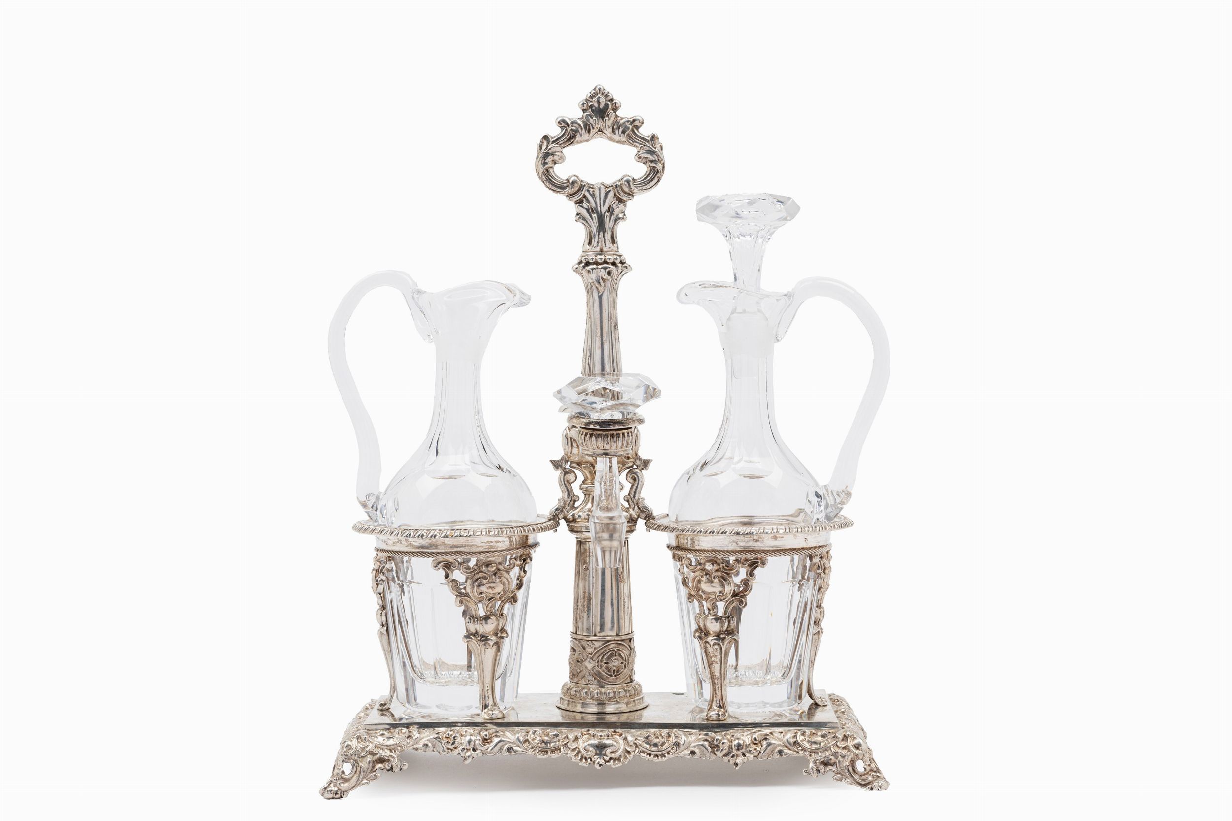 Regno Lombardo Veneto, Milano, XIX secolo argentiere Francesco Ceppi (Milano 1855-1872), cesellata e sbalzata, completa di due ampolle in cristallo (h cm 32,00).