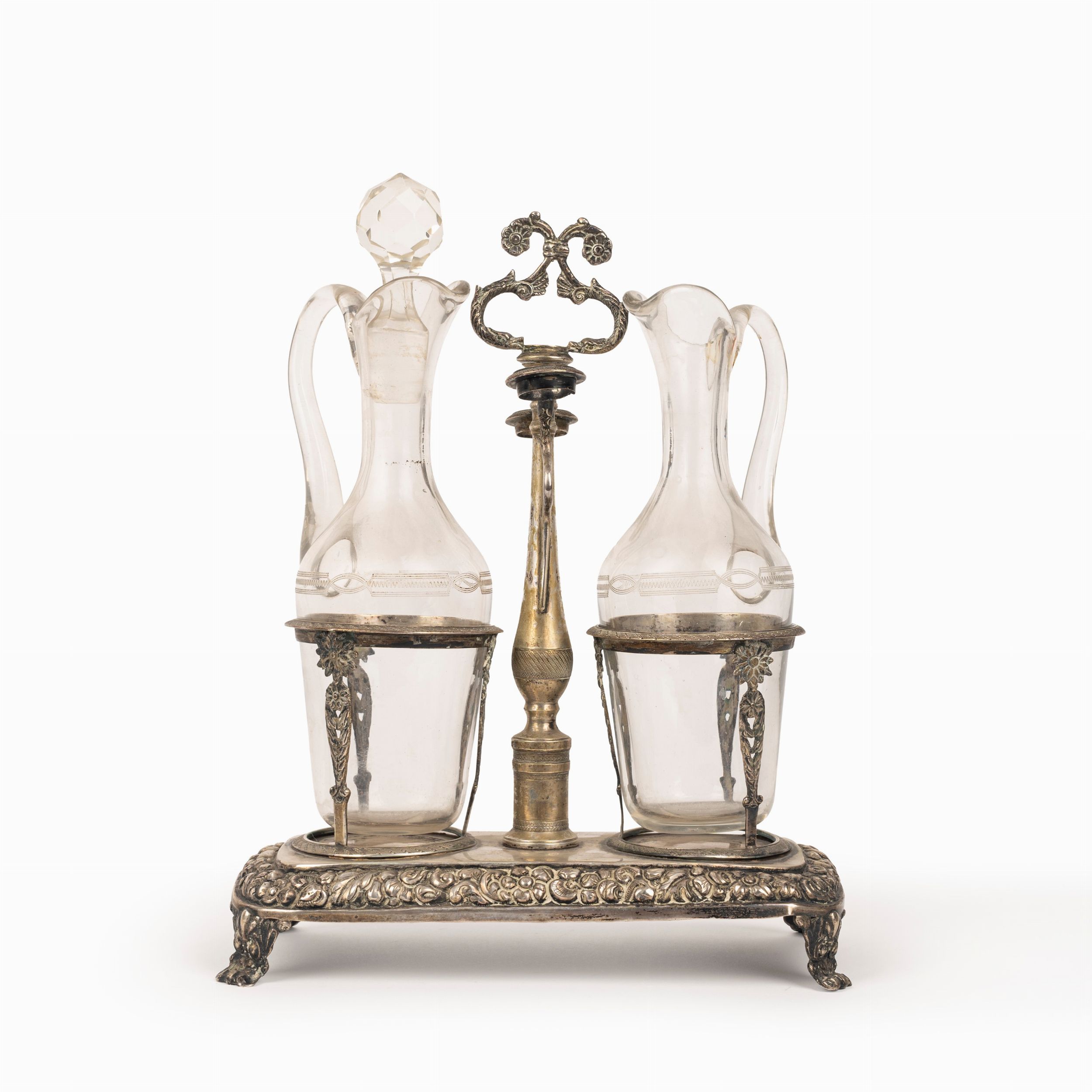 Napoli, 1832-1872 Argentiere SS (non identificato), fusa, sagomata, cesellata e traforata, con monogramma inciso, ampolle in vetro inciso, difetti (un tappo dell'ampolla mancante).