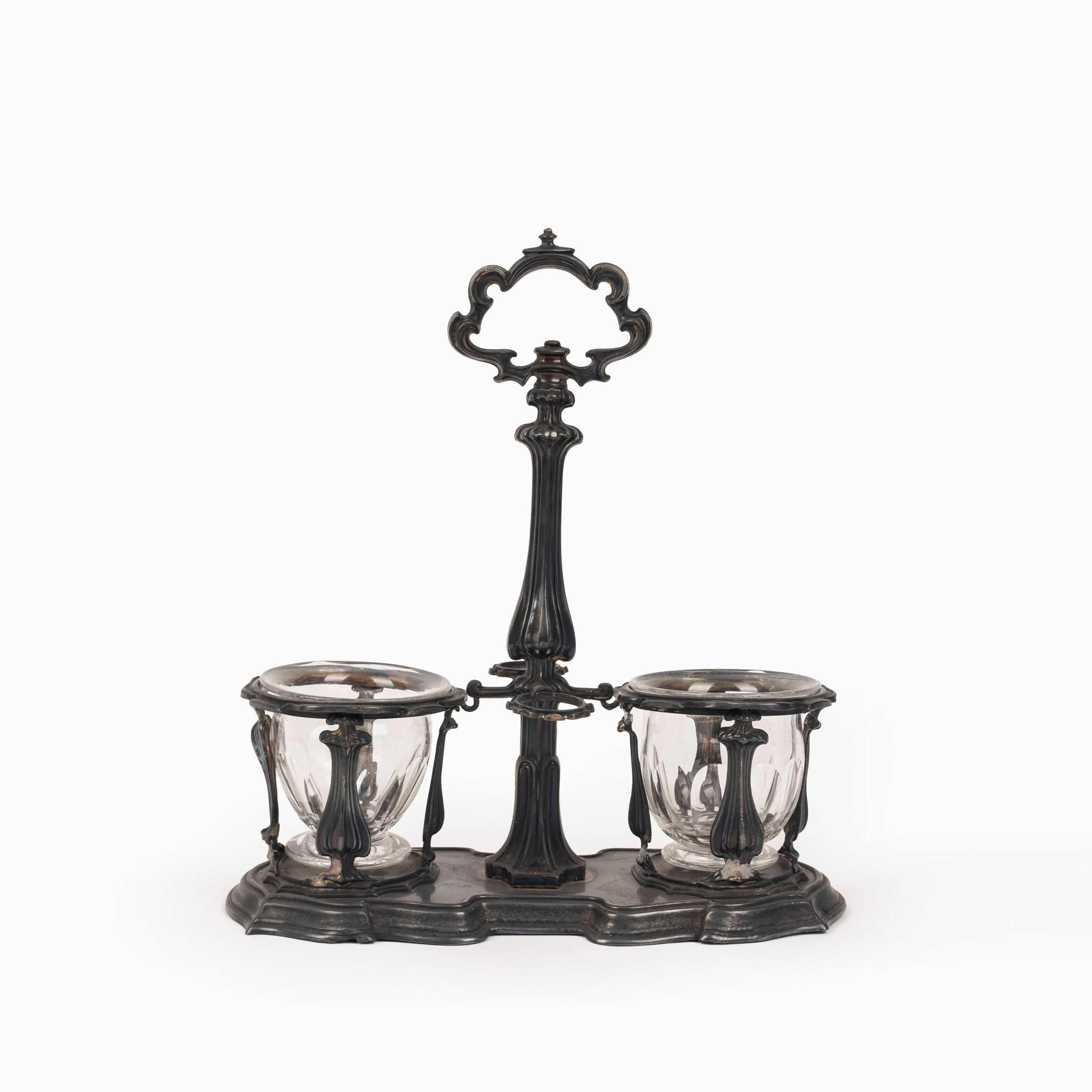 Parigi, prima metà XIX secolo Argentiere Jean François Veyrat fusa e sbalzata, base a profilo gradinato, ampolle in vetro non pertinenti.