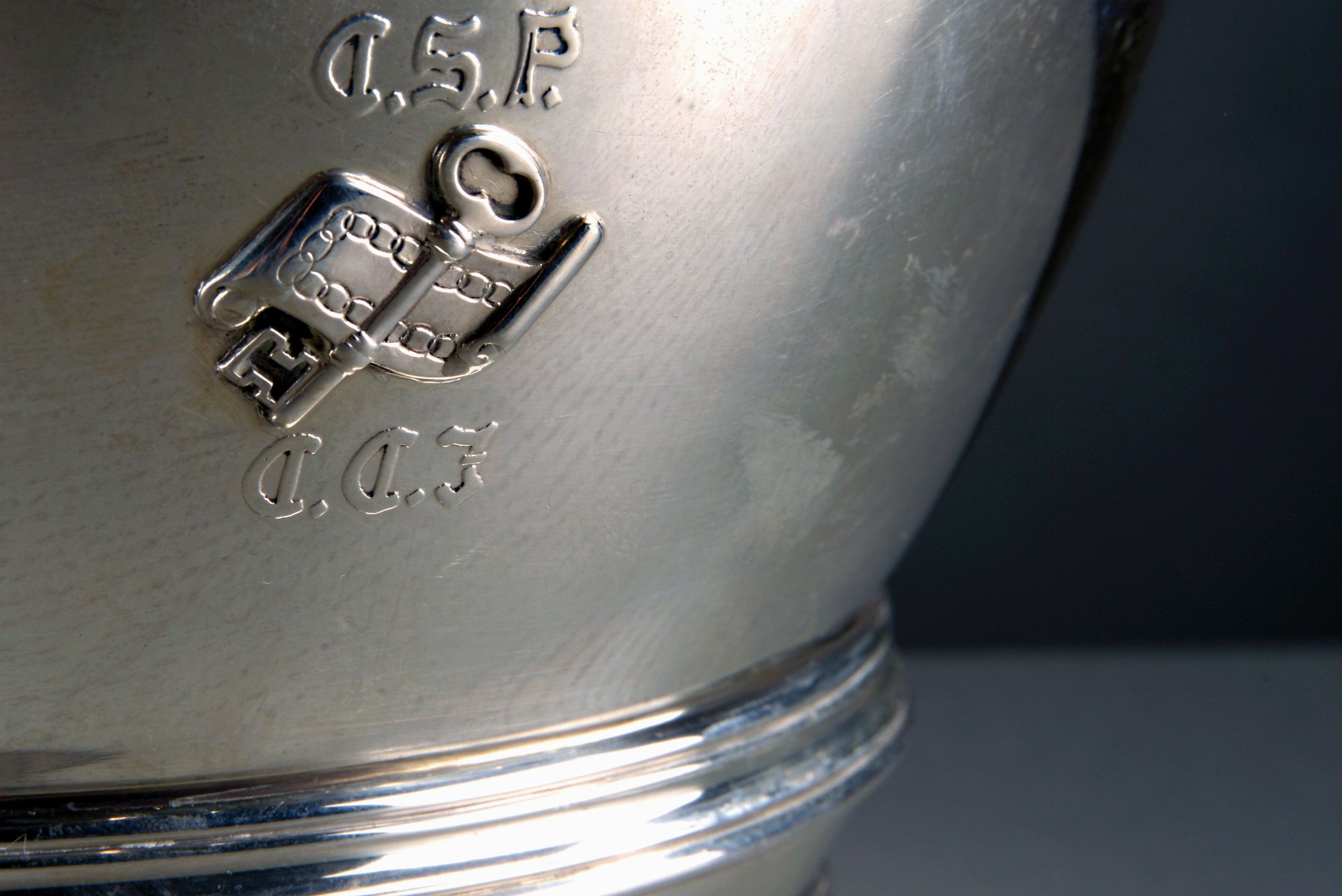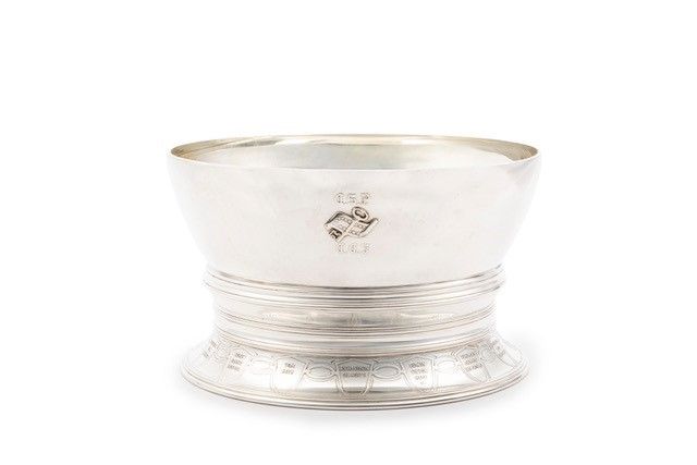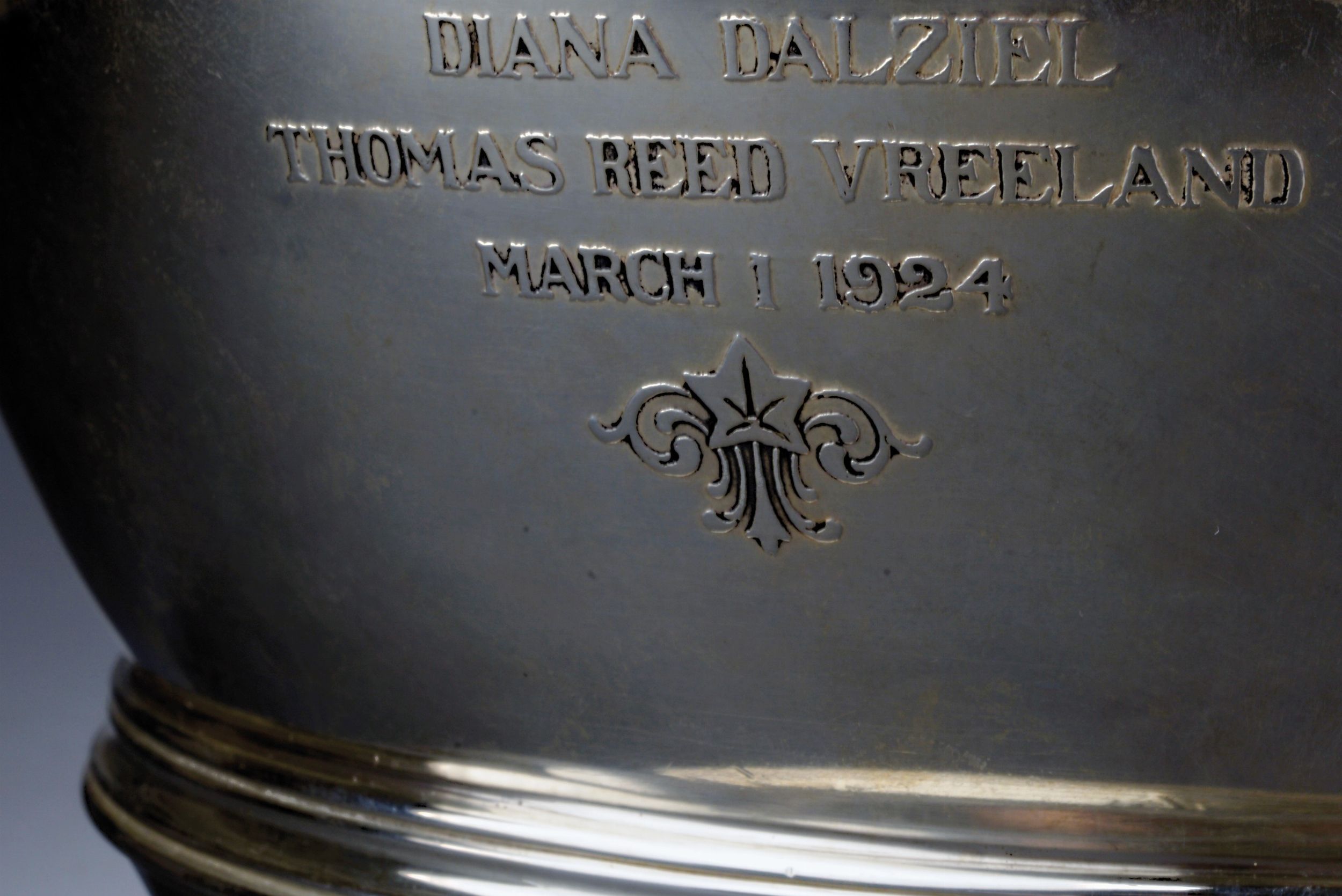 in argento sterling, Peso kg 2,160, diam cm 26,50 x base diam cm 25,00 x h cm 15,50 USA, 1924 Raffinata coppa dalle linee essenziali ed eleganti, a base circolare con monogrammi laterali e crest alla base. Prodotta da Tiffany & Co. su commissione come regalo di nozze per DIANA DALZIEL e THOMAS REED VREELAND.
