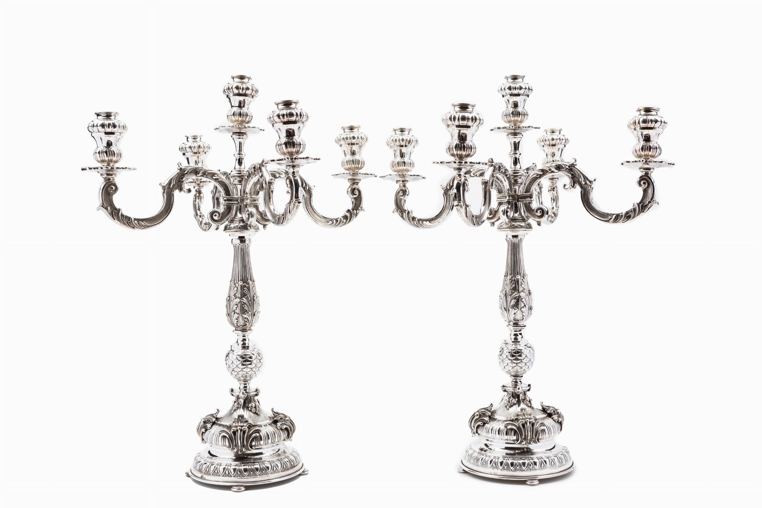 Italia, fine XIX secolo a cinque fiamme, base rotonda, stile barocco, lavorazione a fusione e sbalzo.
