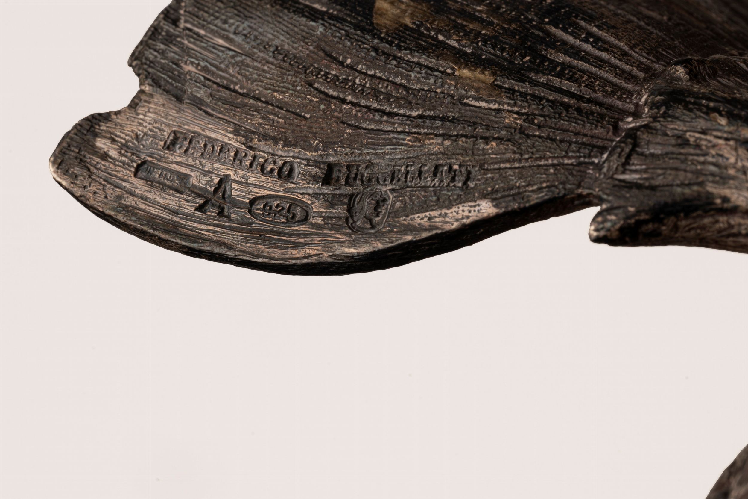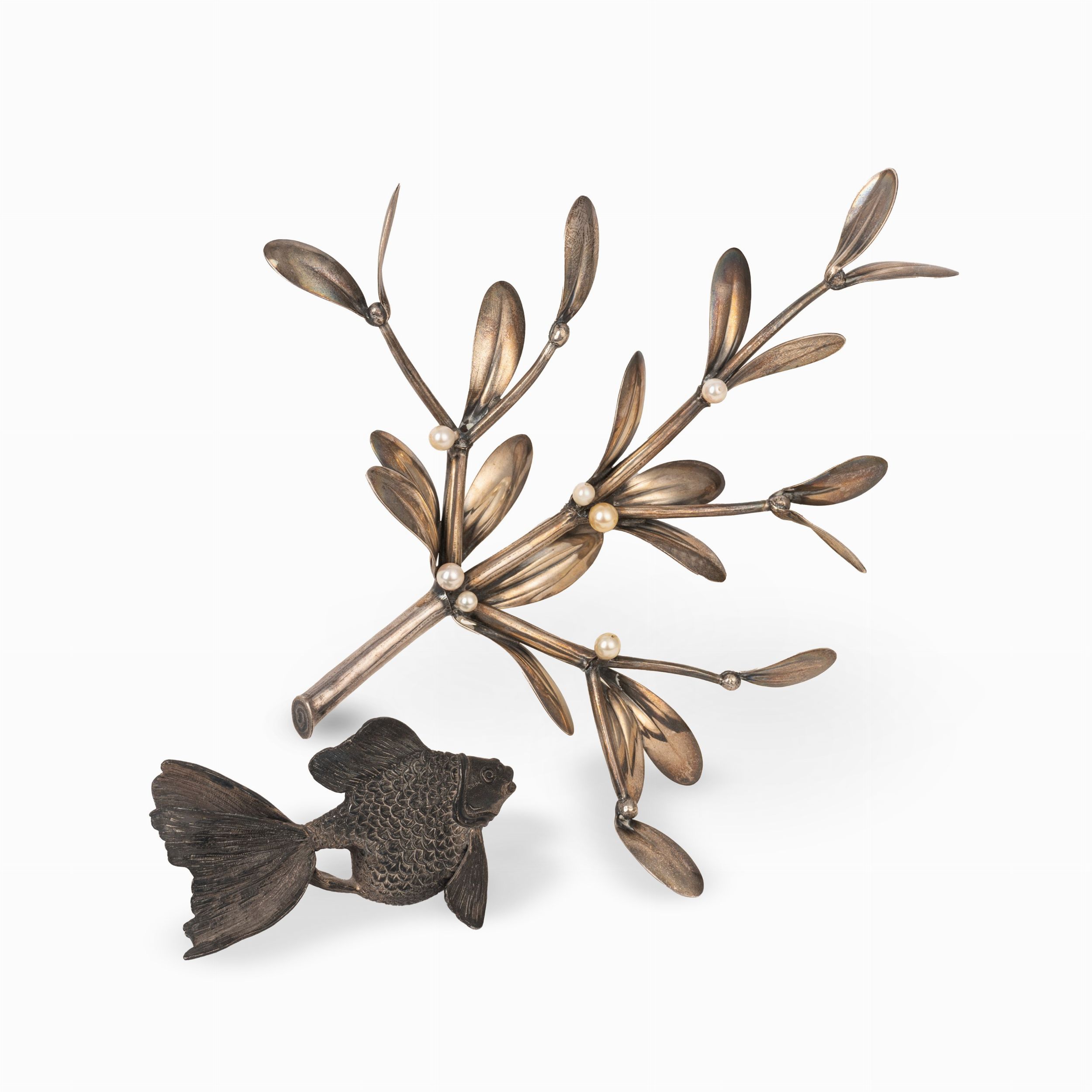 Milano, metà XX secolo un pesce, fuso sagomato e inciso (l cm 9,50) e un ramo di vischio decorato con perle (l cm 22,00x19,00).
