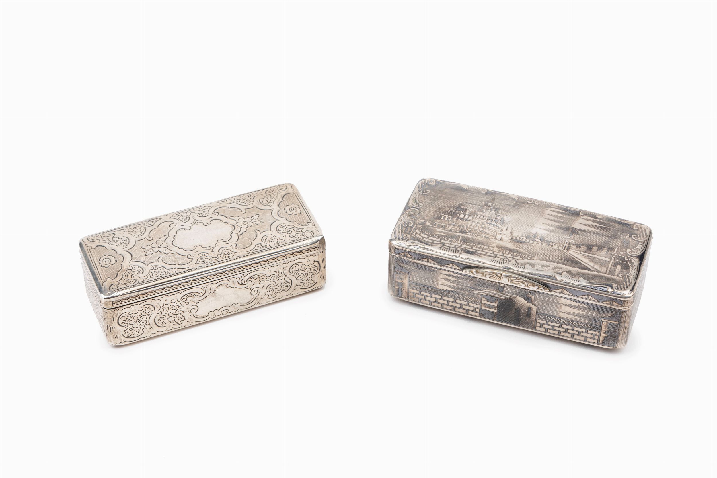 Russia e Austria, XIX secolo argentieri HM e JAH (non identificati), entrambe di forma rettangolare con interno in vermeil, la scatola russa (l cm 9,00x4,00x3,00) interamente decorata a niello con vedute di monumenti, la scatola austriaca (l cm 8,50x3,50x2,50) a decori incisi.