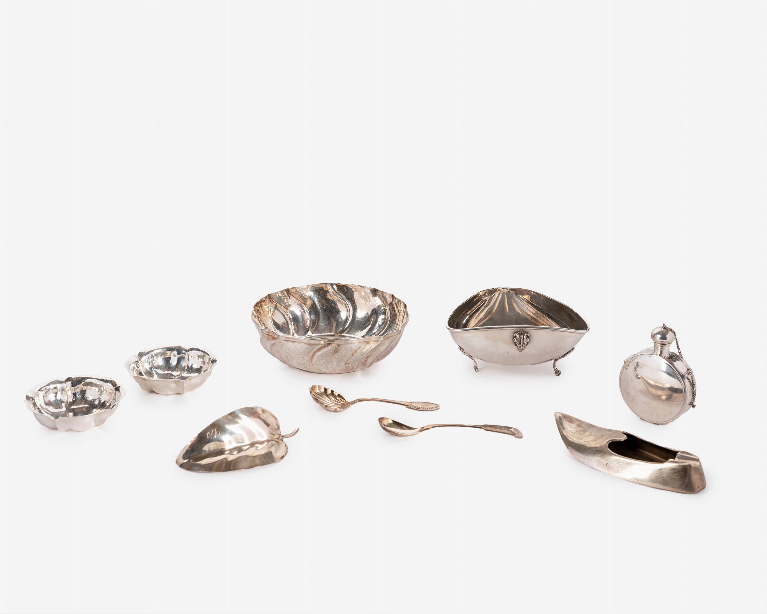 Italia, XX secolo composto da tre ciotole con motivo a torchon di misure diverse (diam cm 9,00-16,00), una ciotola di forma triangolare su tre piedini, un posacenere a babbuccia, un soprammobile a foglia, una fiaschetta tonda e due cucchiaini.