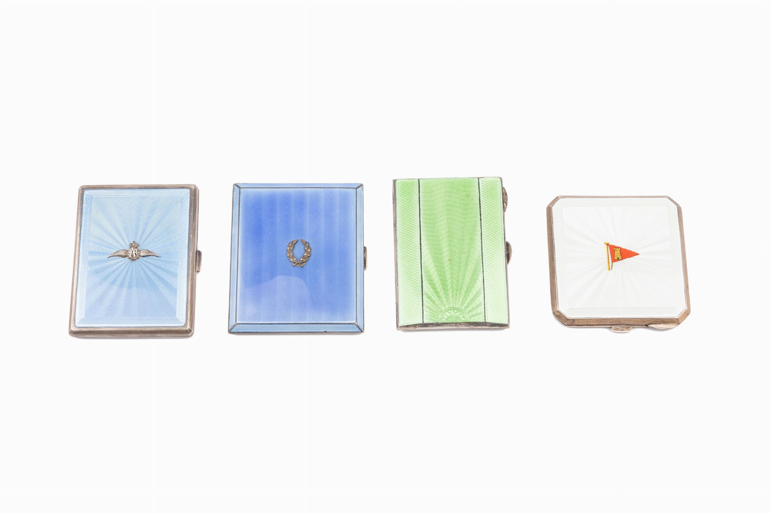Birmingham, prima metà XX secolo tre portasigarette e un portacipria (specchietto interno con difetti), con smalti guilloché nei toni dell'azzurro, verde e bianco.