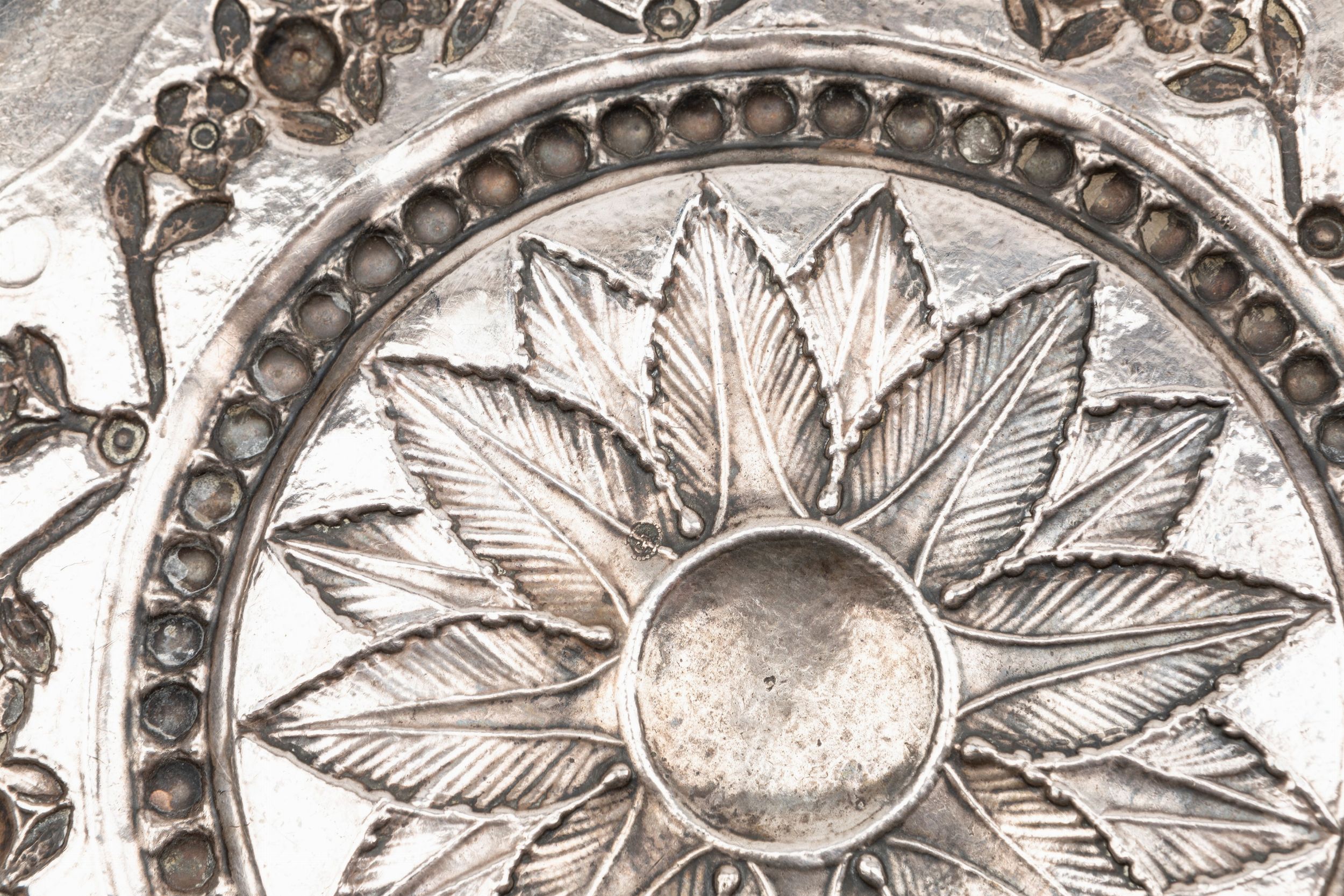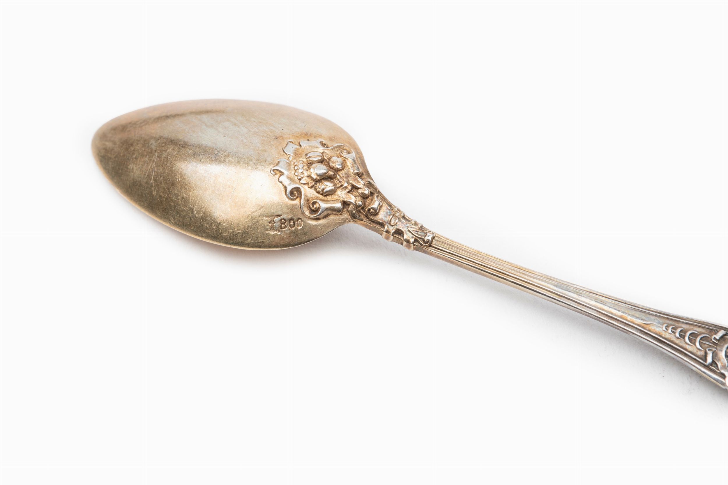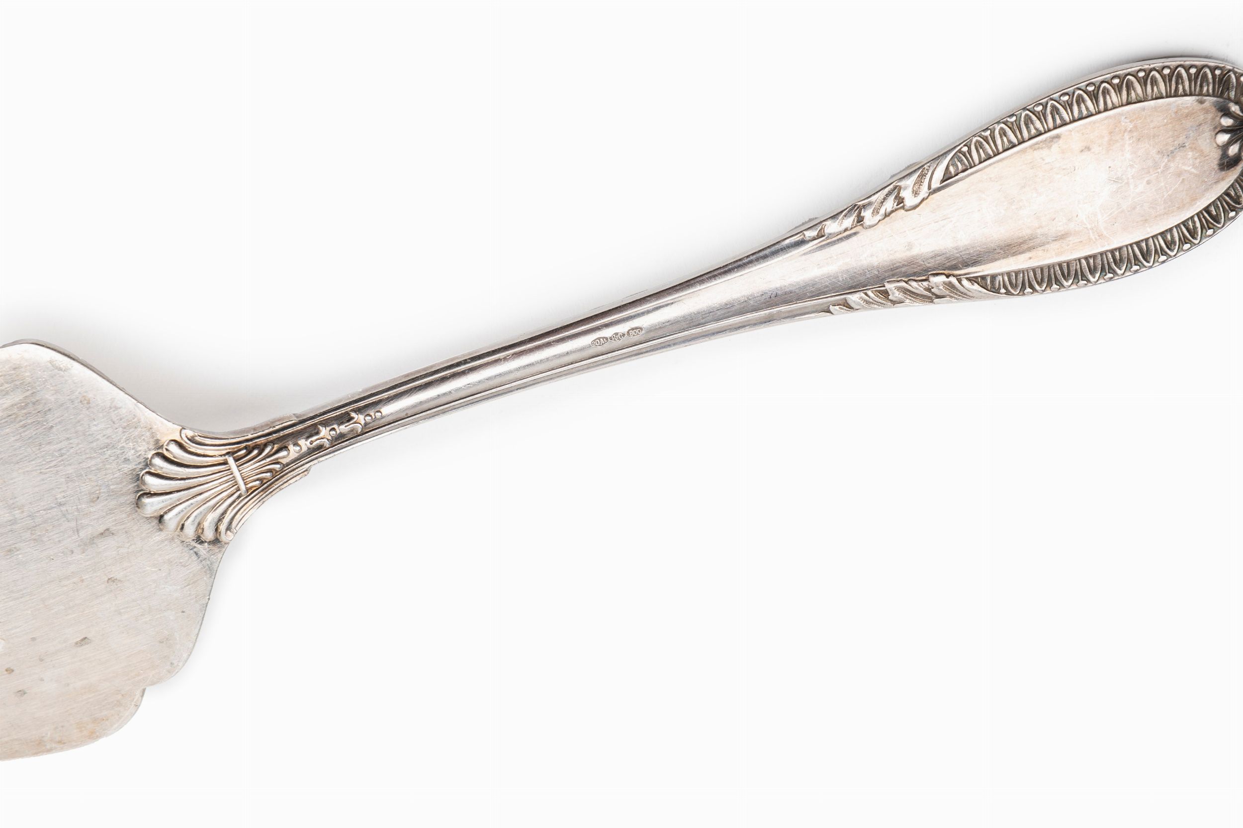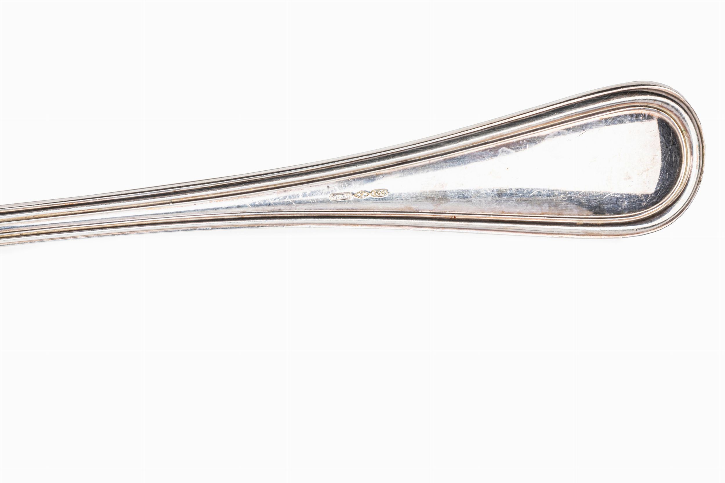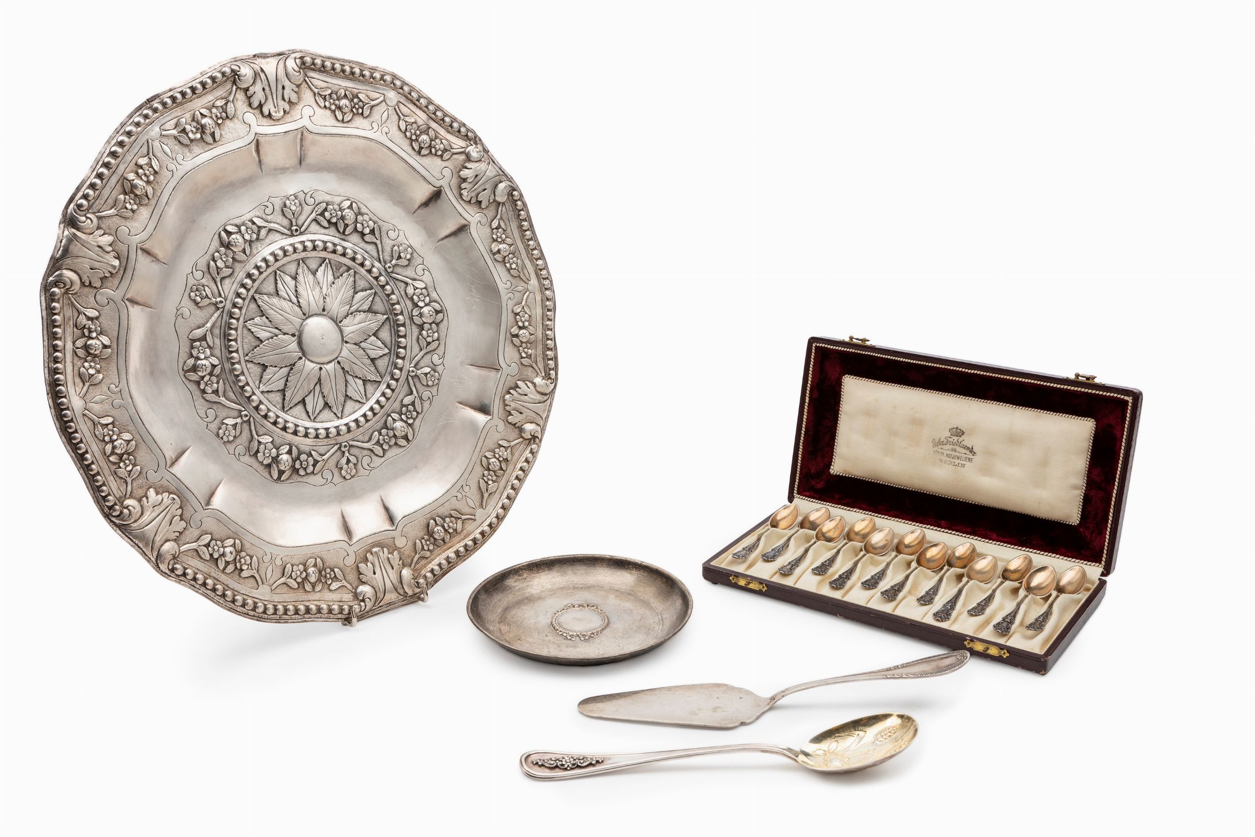 Italia, XX secolo composto da 12 cucchiaini da caffè con scatola, 1 paletta da dolce, 1 cucchiaio da dolce, 1 piatto sbalzato e inciso (diam cm 41,00), 1 piatto con al centro ghirlanda a rilievo, Vavassori, arg. 925 (diam cm 16,50).