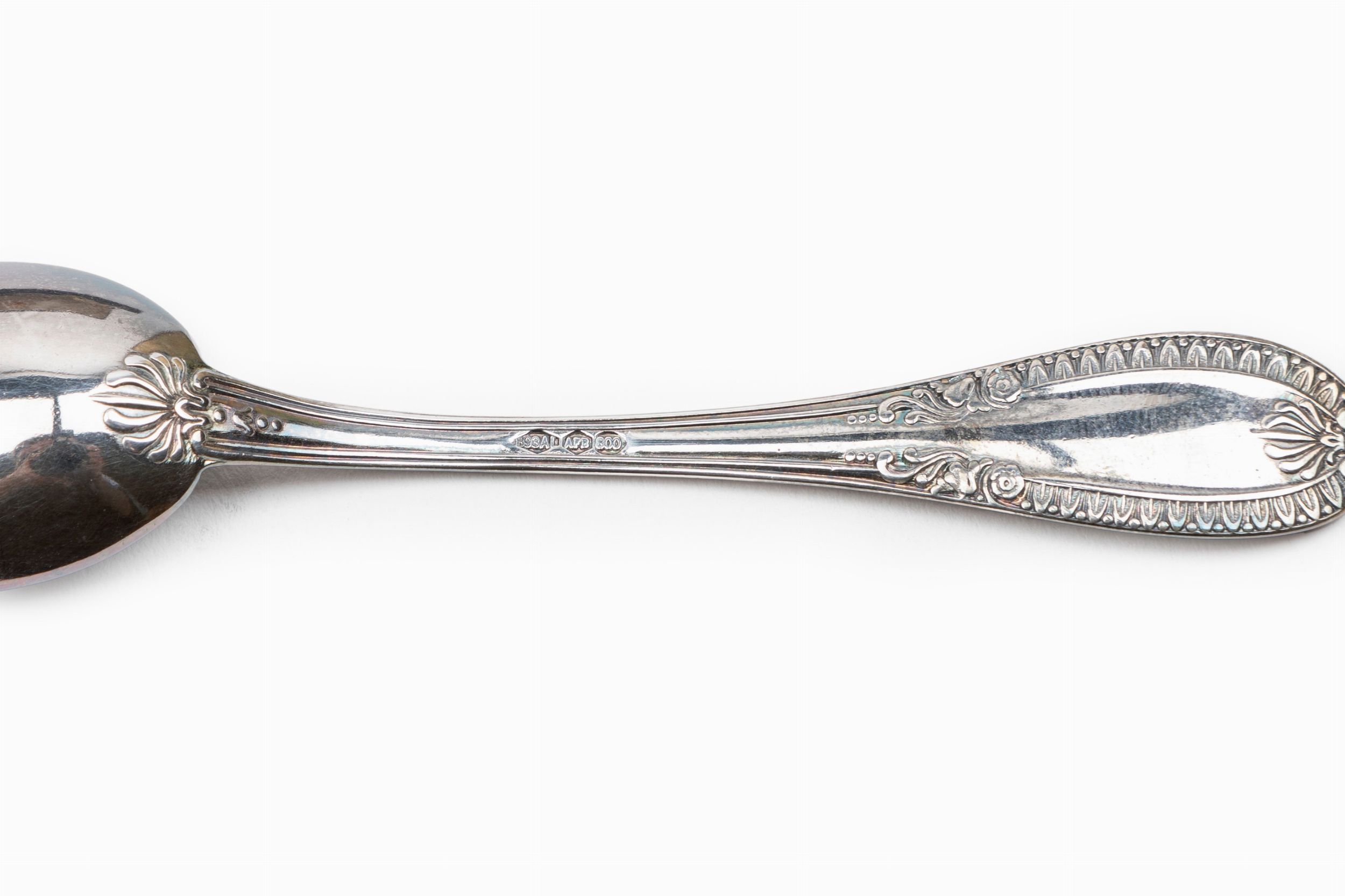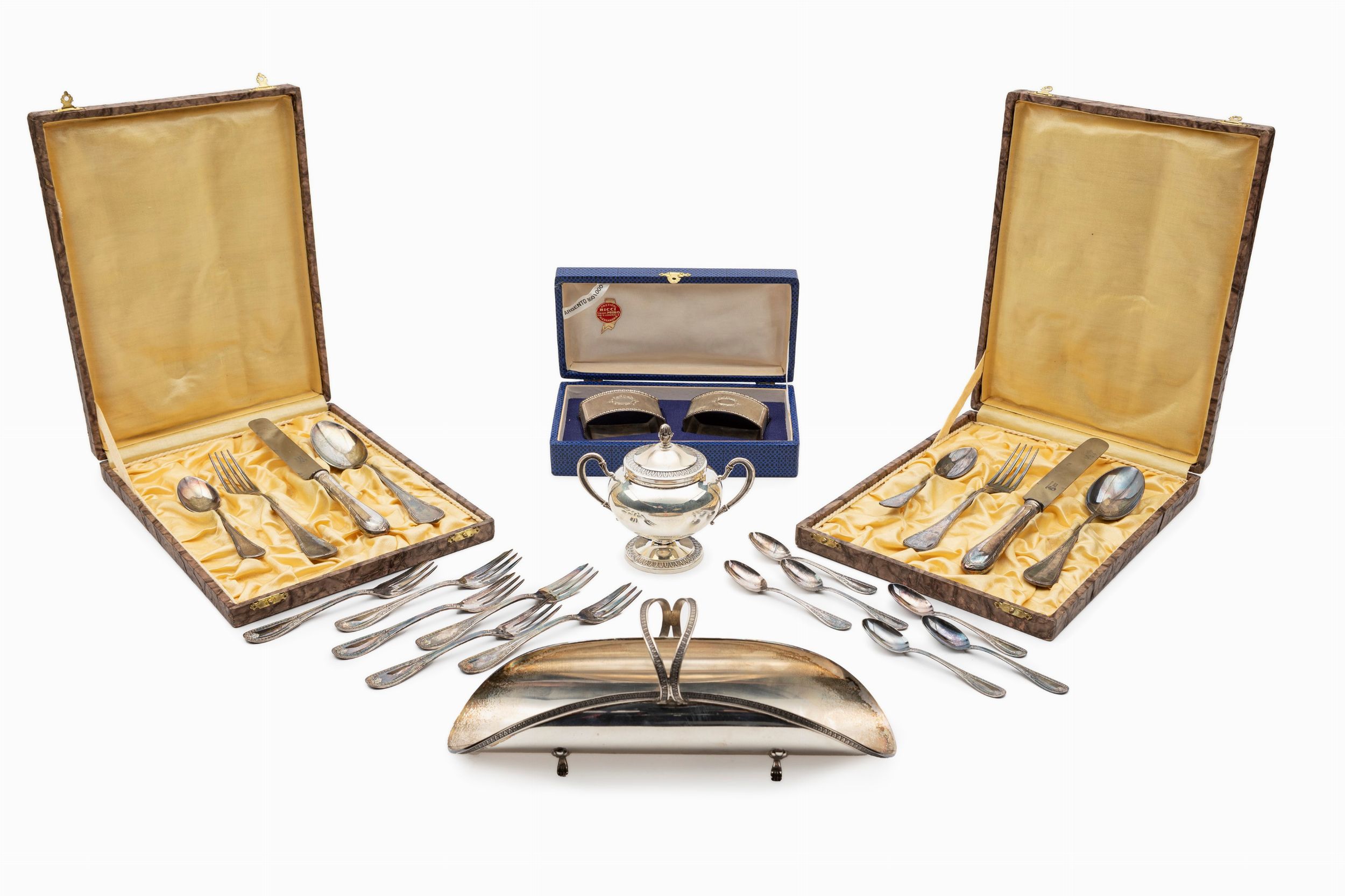 Italia, XX secolo composto da un porta grissini, una piccola zuccheriera, due portatovaglioli, sei forchettine da dolce, sei cucchiaini da caffè, due posto tavola (forchetta, coltello, cucchiaio e cucchiaino), con scatole.