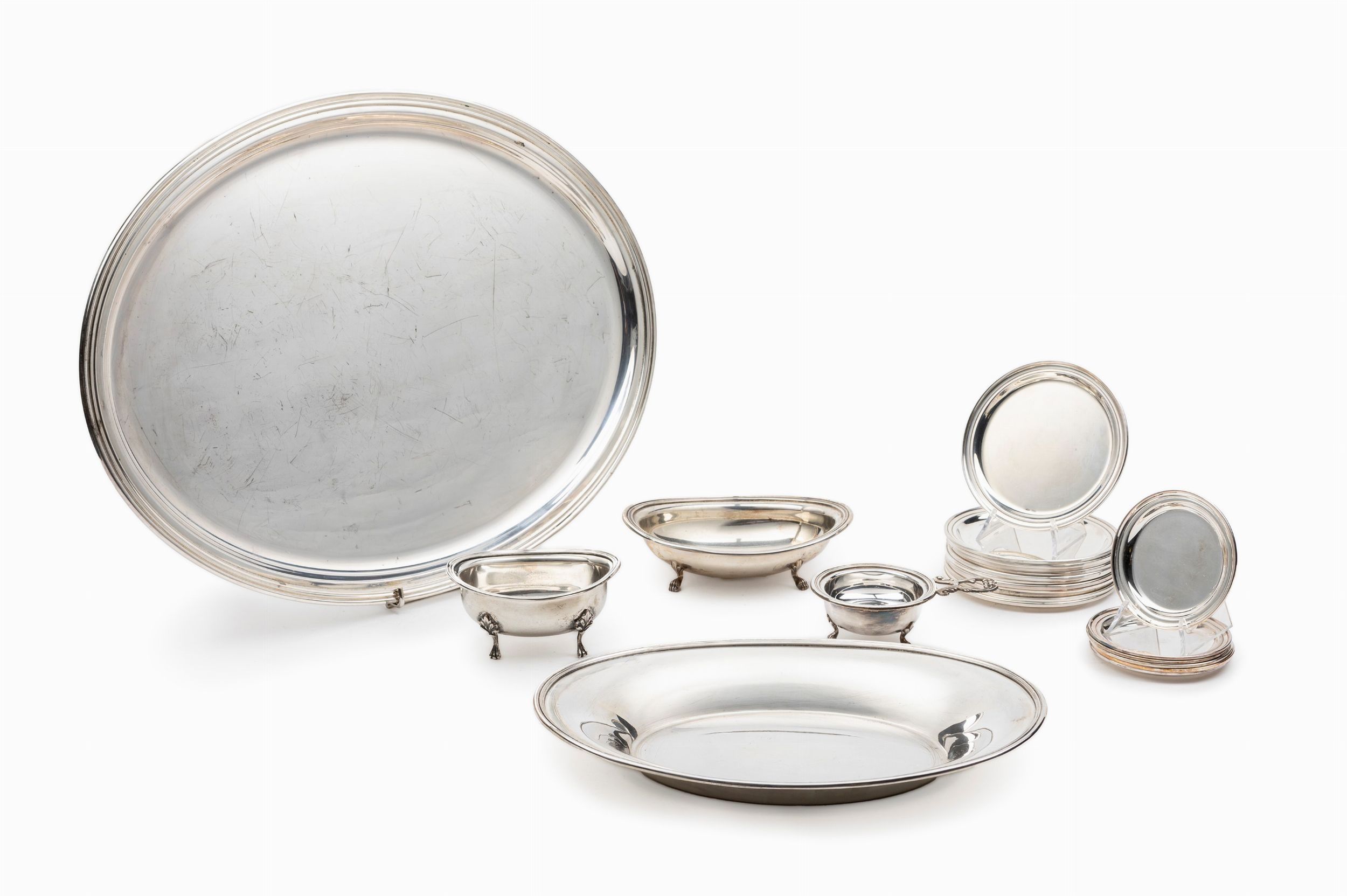 Italia, XX secolo composto da un vassoio ovale, dodici piattini pane, sei sotto bicchieri, tre ciotole ovali, un colino.
