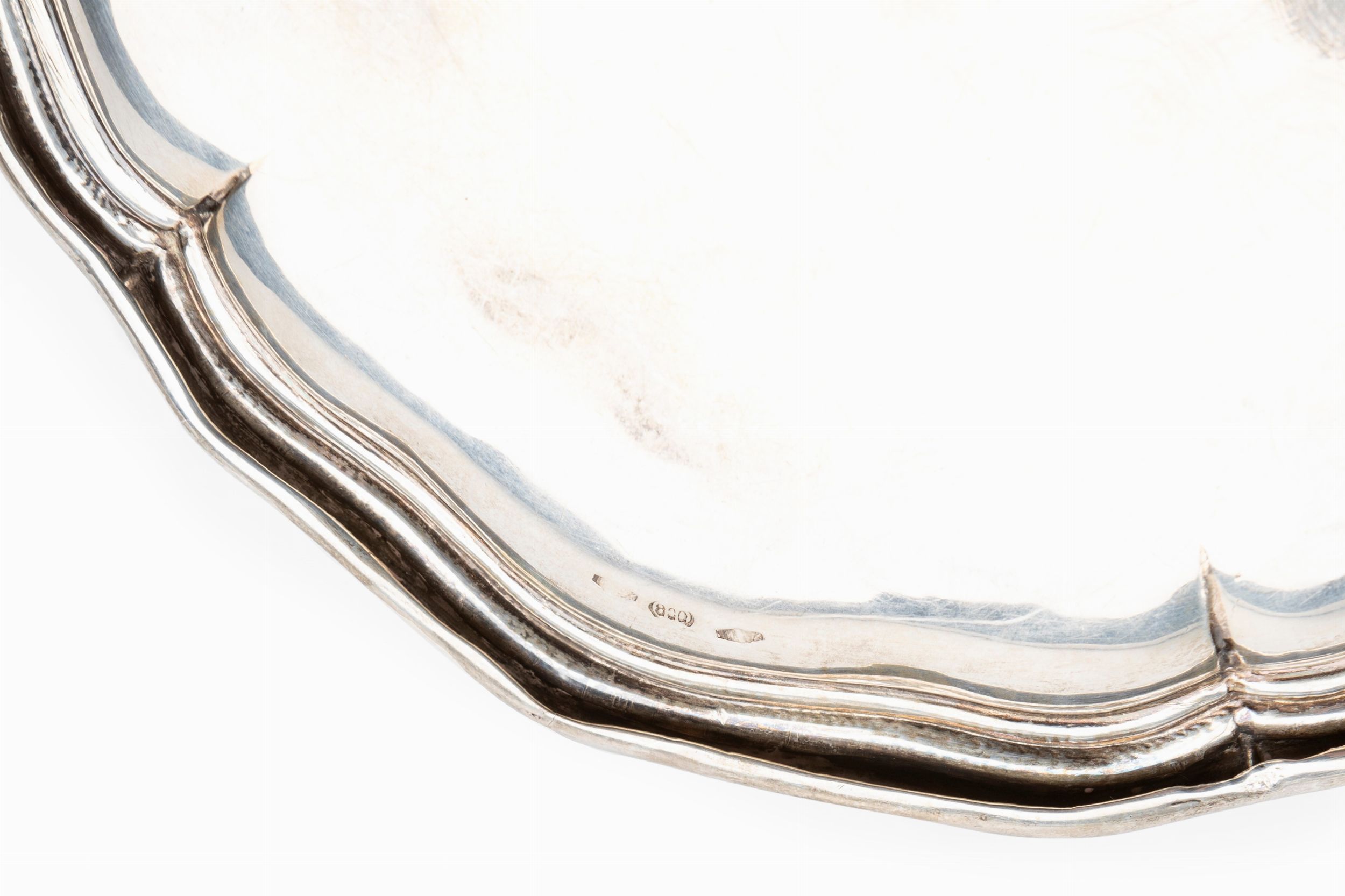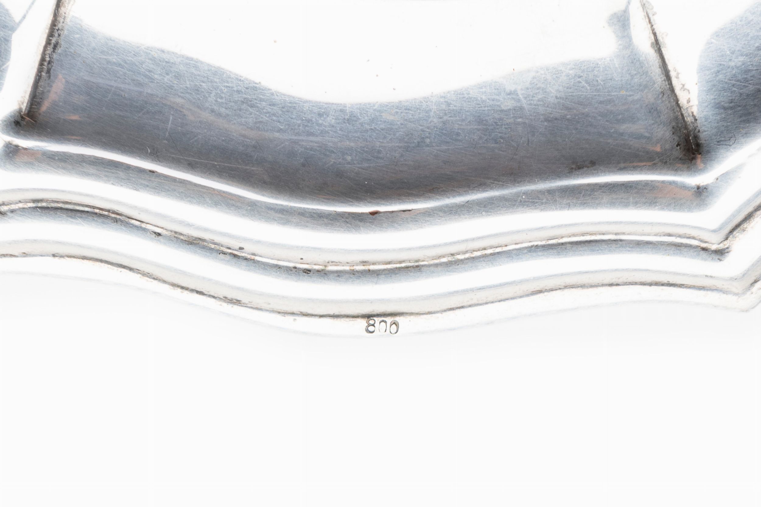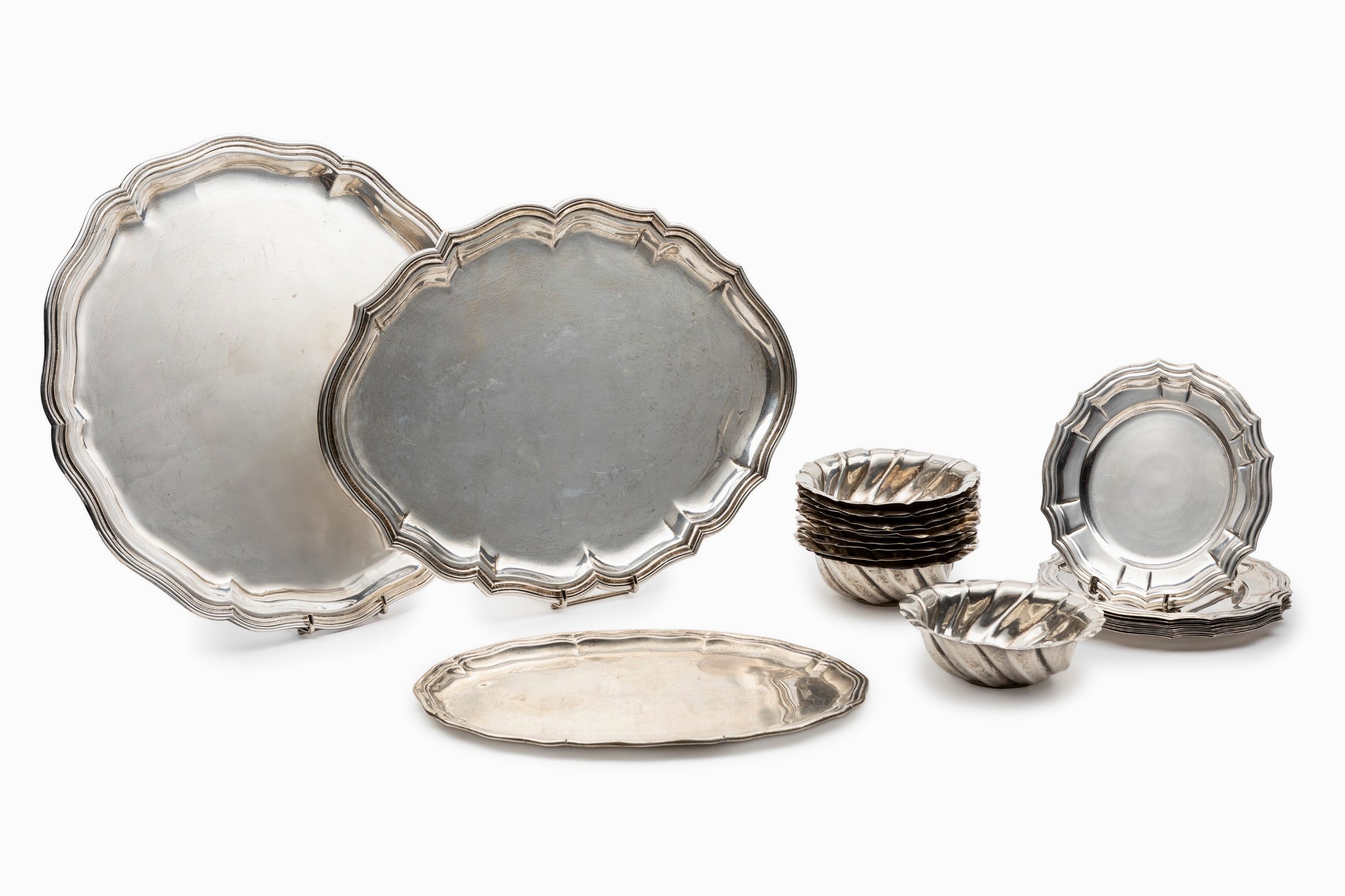 Italia, XX secolo composto da 27 pezzi: un piatto (diam cm 36,00), due vassoi ovali (cm 29,00x39,00 - 19,00x29,00), dodici piattini pane (diam cm 18,00) e dodici ciotole lavadita (diam cm 13,00), dal profilo mistilineo.
