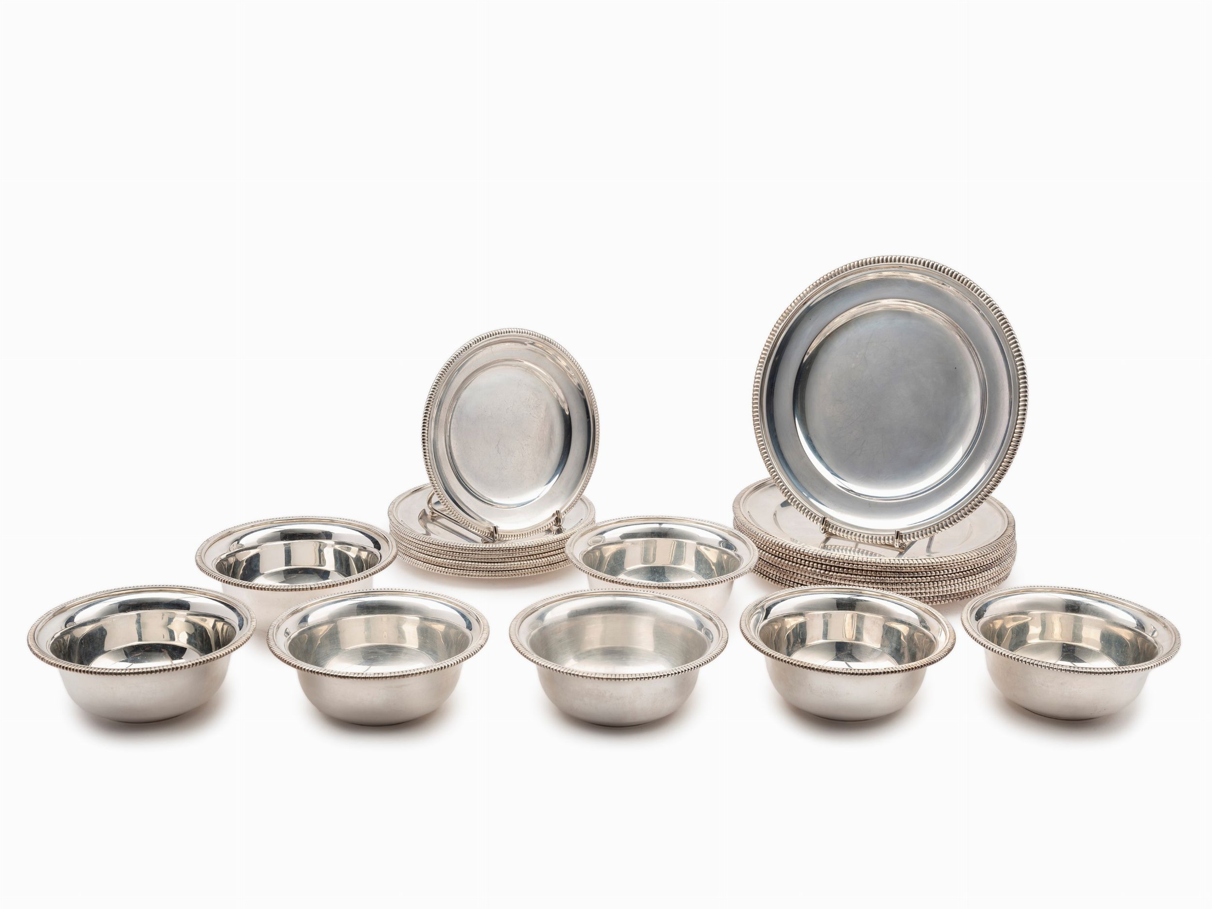 Italia, XX secolo lisci, a bordo cordonato, composto da diciannove piatti circolari, di cui dieci da frutta (d cm 22,00) e nove da pane (d cm 16,00), e sette ciotole lavadita (d cm 14,00).
