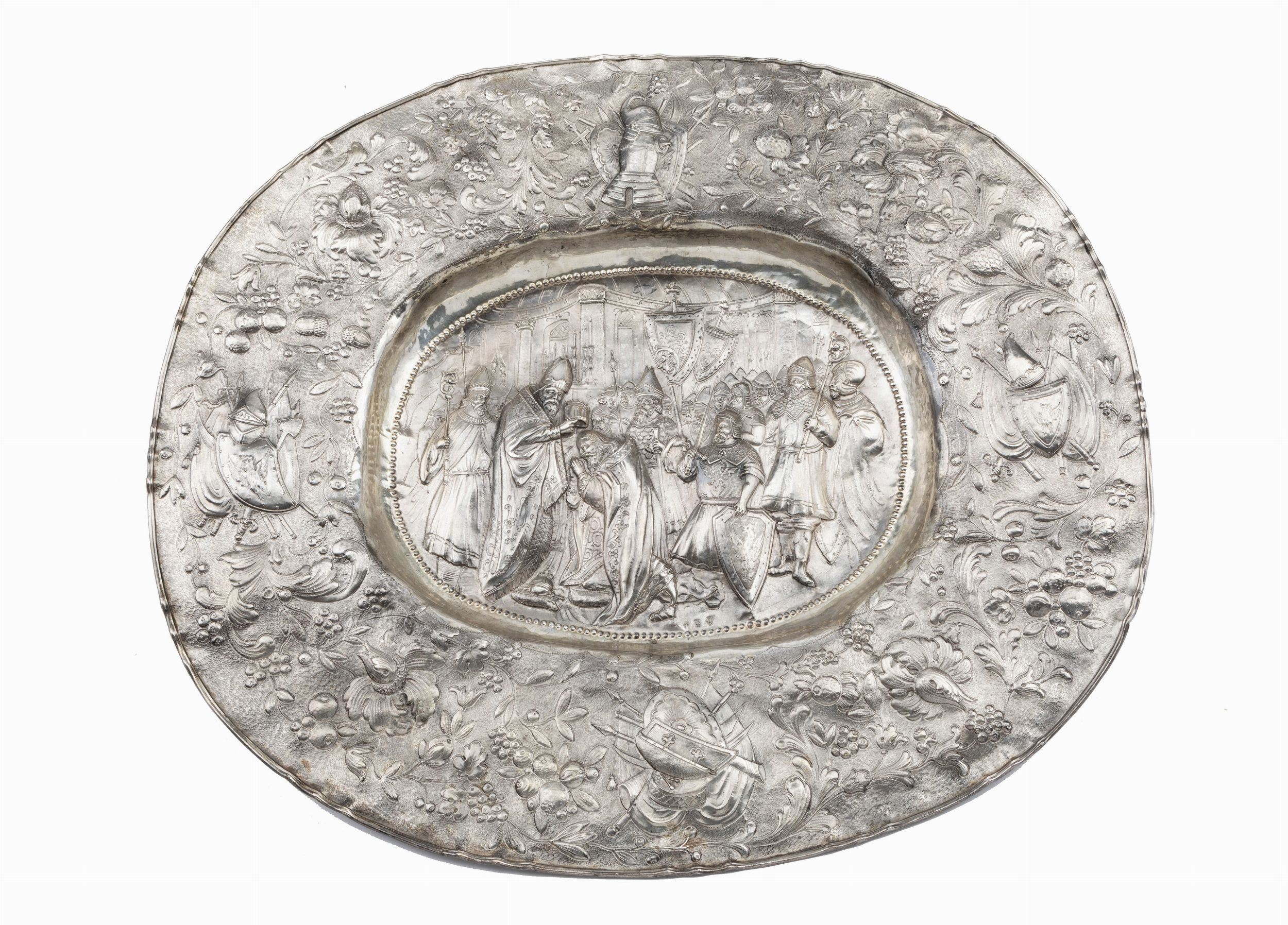 Europa Centrale, XIX-XX secolo di forma ovale, riccamente sbalzato e cesellato, raffigurante incoronazione.