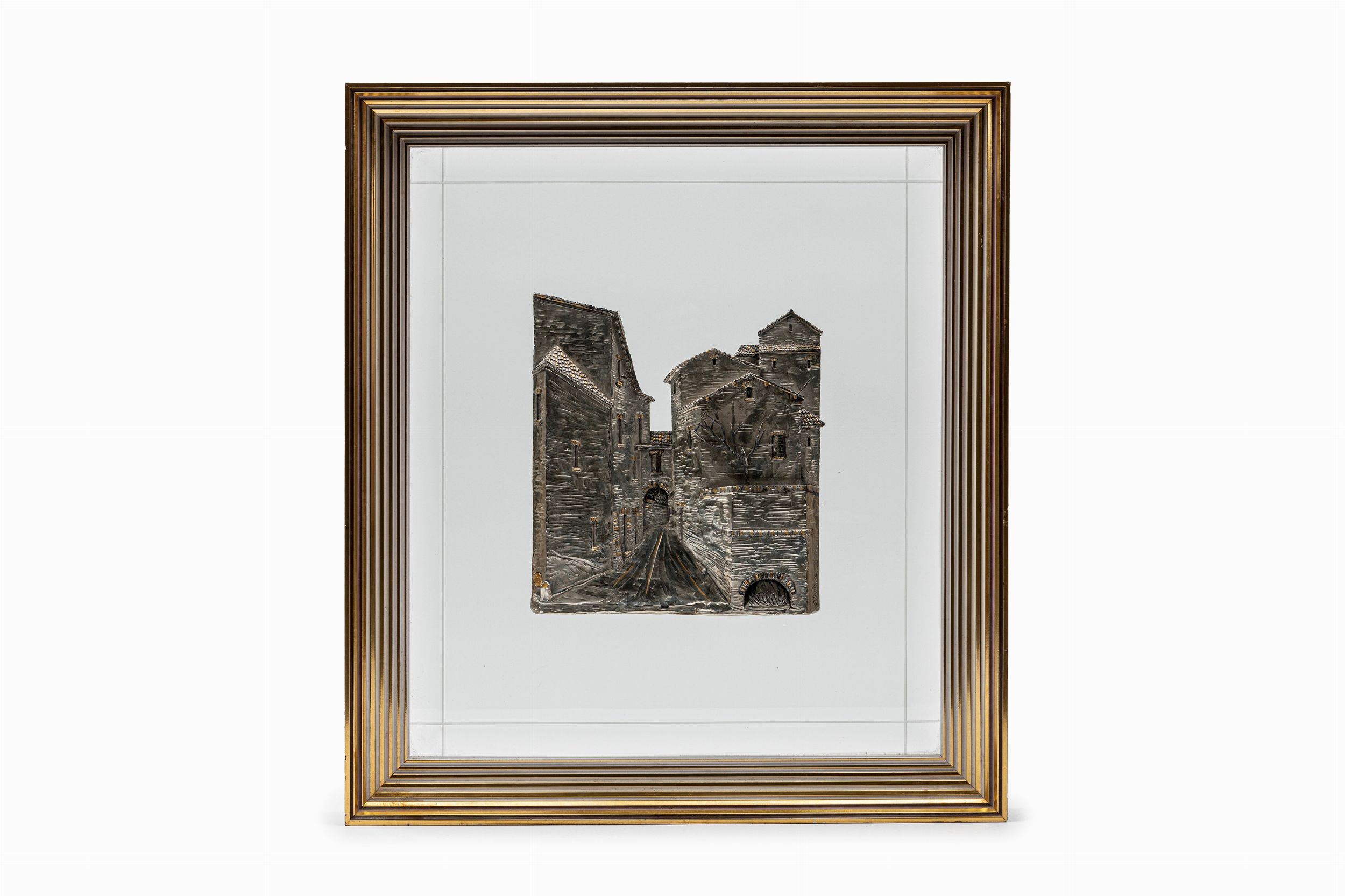 Italia, XX secolo in lastra ad altorilievo raffigurante scorcio di borgo, entro cornice in vetro e legno.