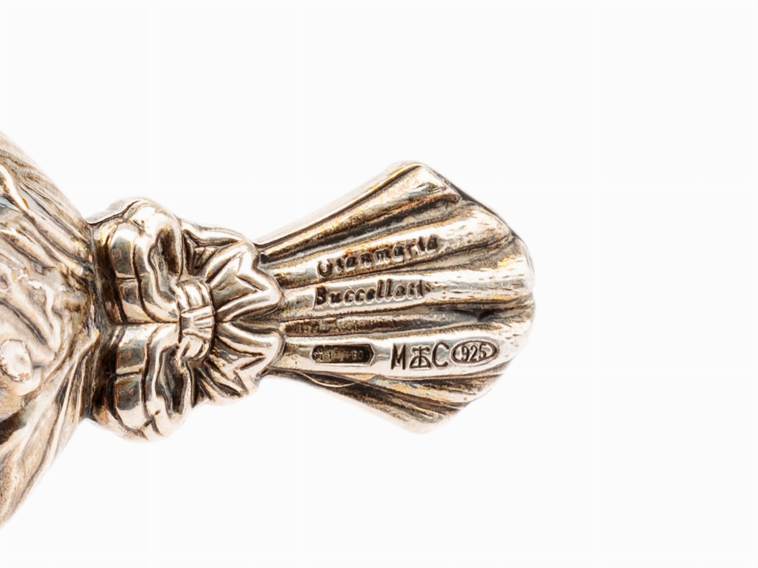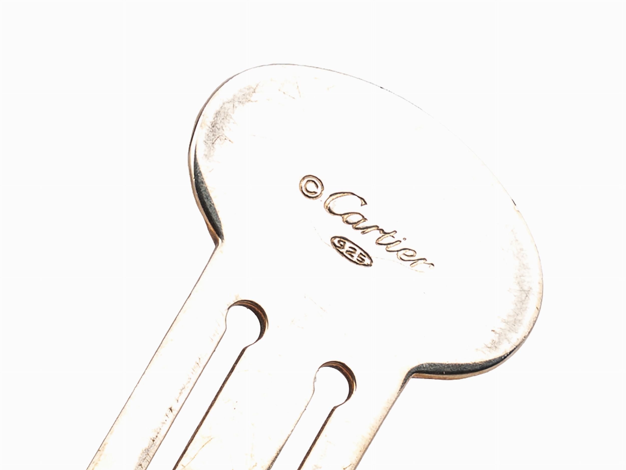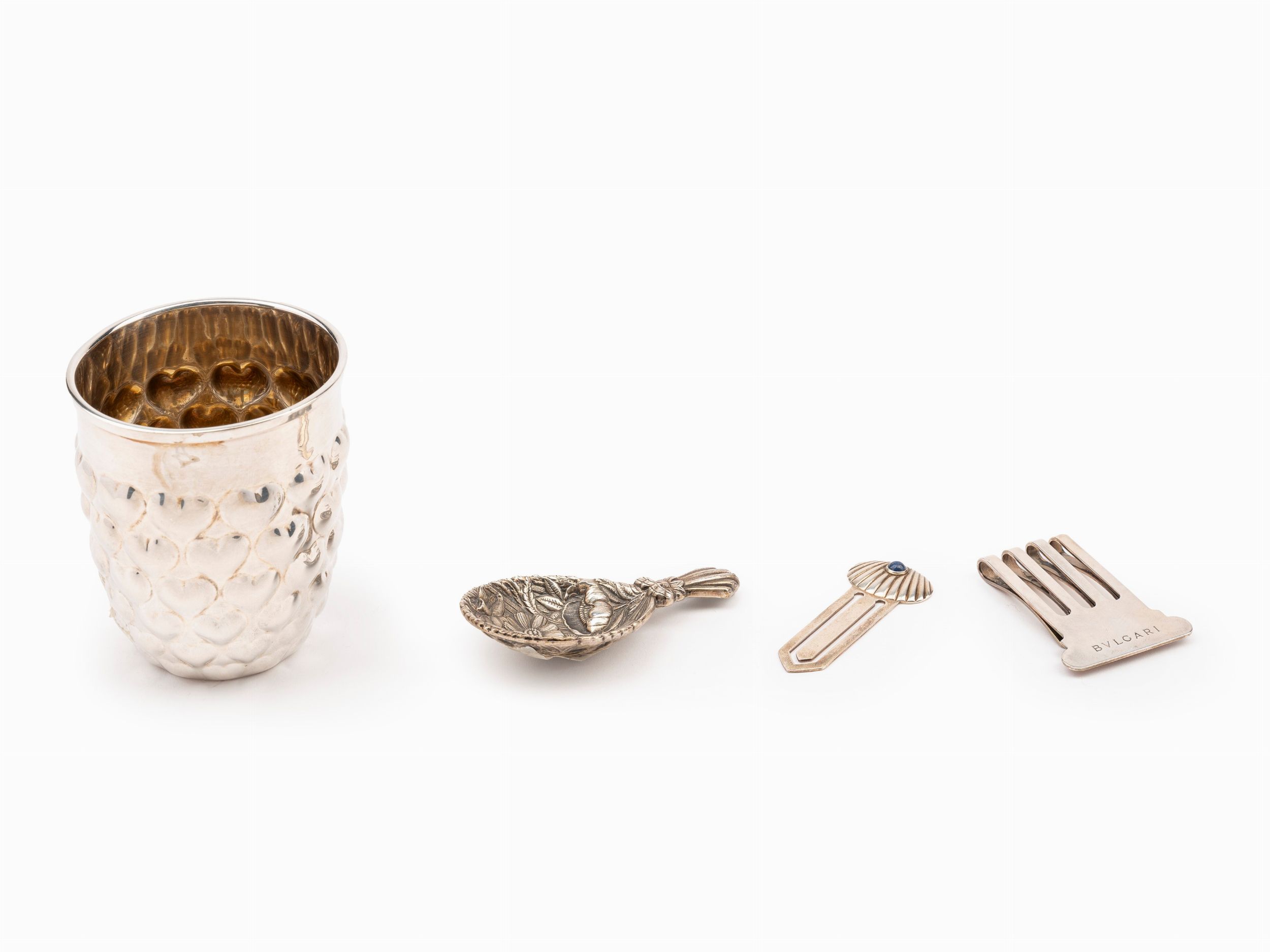 in argento 925, Peso g 188,00 Italia, XX secolo un bicchiere firmato Pampaloni con decoro a cuori, una ciotolina firmata Gianmaria Buccellati con decori a rilievo, un ferma soldi firmato Bulgari di forma rettangolare a cancello e un segna libro firmato Cartier a motivo ovale con lapislazzuli.