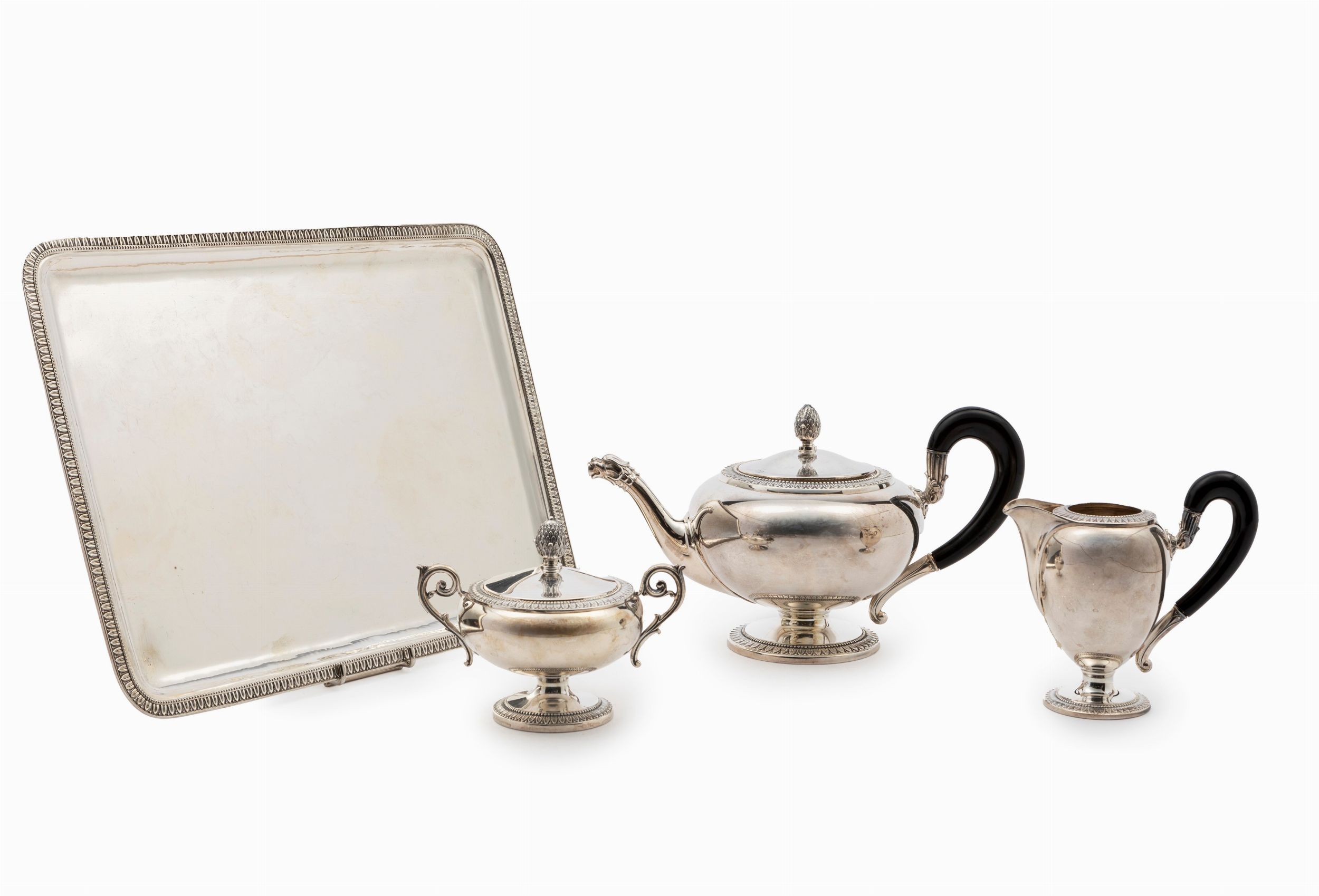Italia, XX secolo composto da zuccheriera, teiera e lattiera con manico in legno, e vassoio, a decoro stile Impero.