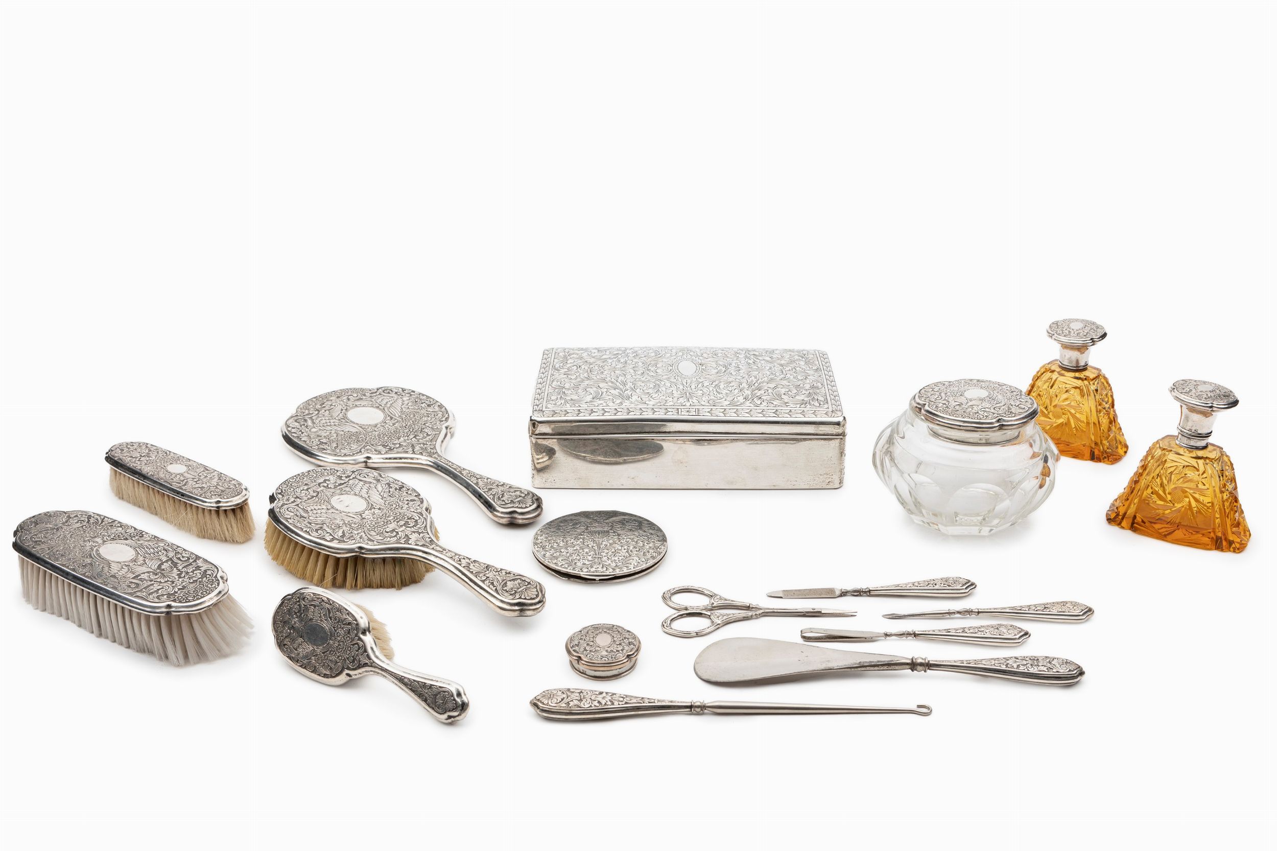 Italia, inizi XX secolo composto da 17 pezzi con decoro floreale inciso e sbalzato: scatola porta oggetti con interno in legno, quattro spazzole, uno specchio a mano, un porta cipria, un barattolo in cristallo molato trasparente, due boccette in cristallo molato giallo, un tappo, sei accessori da manicure e toilette.