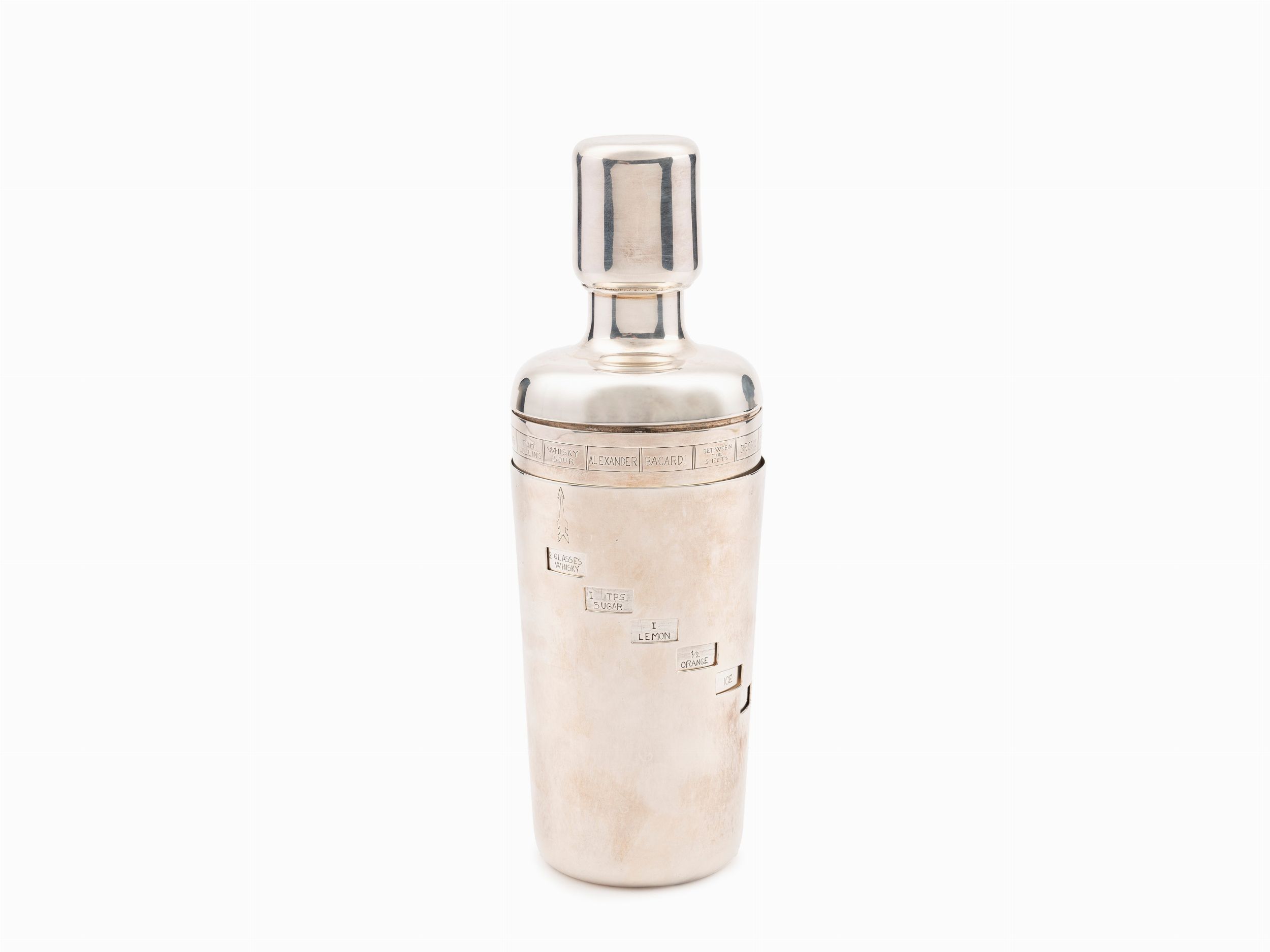 Italia, metà XX secolo con ricetta 'dial a drink', il meccanismo funziona ruotando lo shaker, ogni piccola regolazione rivela delle finestre che descrivono come preparare un cocktail diverso.