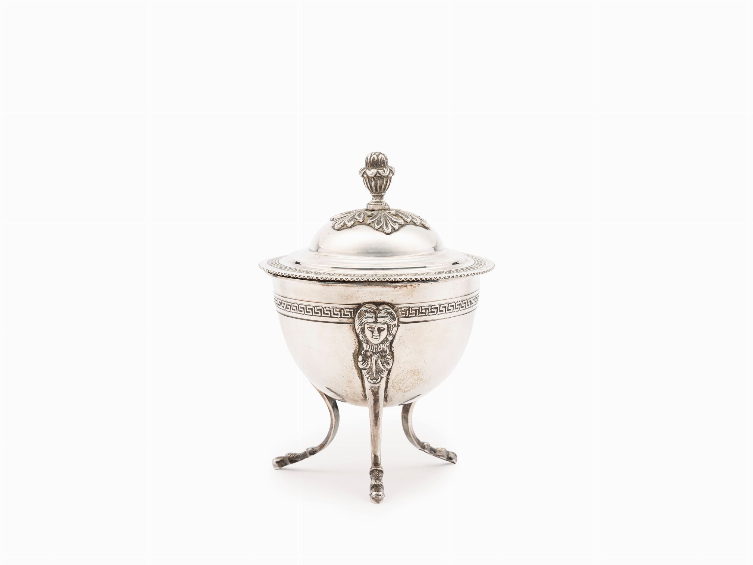 in argento, Peso g 200,00 h cm 12,50 Regno Lombardo Veneto, 1812-1872 punzone dell'argentiere consunto e di difficile lettura, reca punzoni della città di Venezia, poggiante su tre piedini zoomorfi, mascherone all'attacco, il coperchio con motivo alla greca e presa del coperchio a foggia di vaso di fiori.