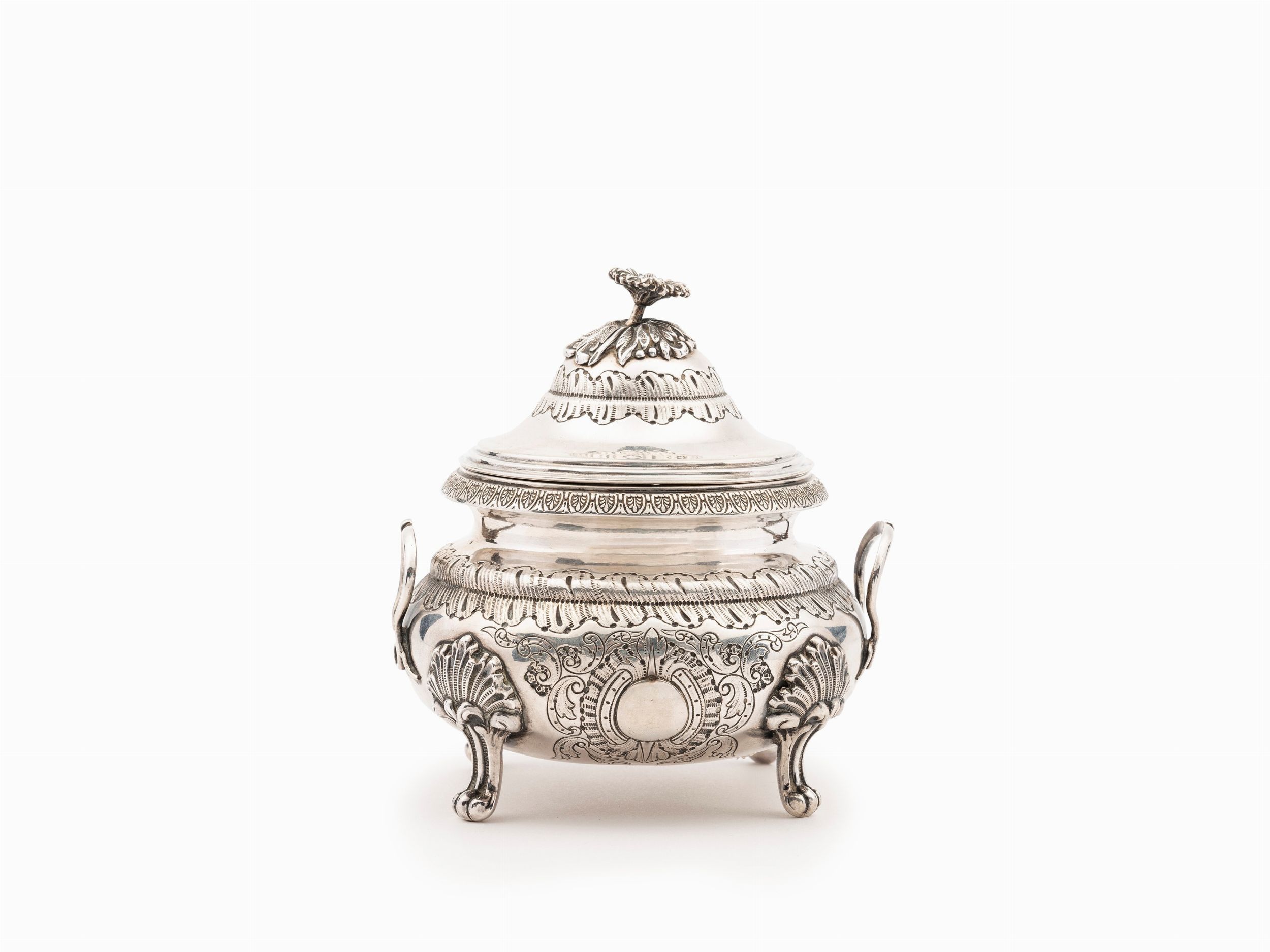Regno di Sardegna, XIX secolo argentiere CB (Carlo Balbino, Torino 1798-1824), punzonato successivamente con punzone di Nizza, biansata, poggiante su quattro piedini con decoro a valva di conchiglia, corpo cesellato a volute fogliate, presa del coperchio a fiore.