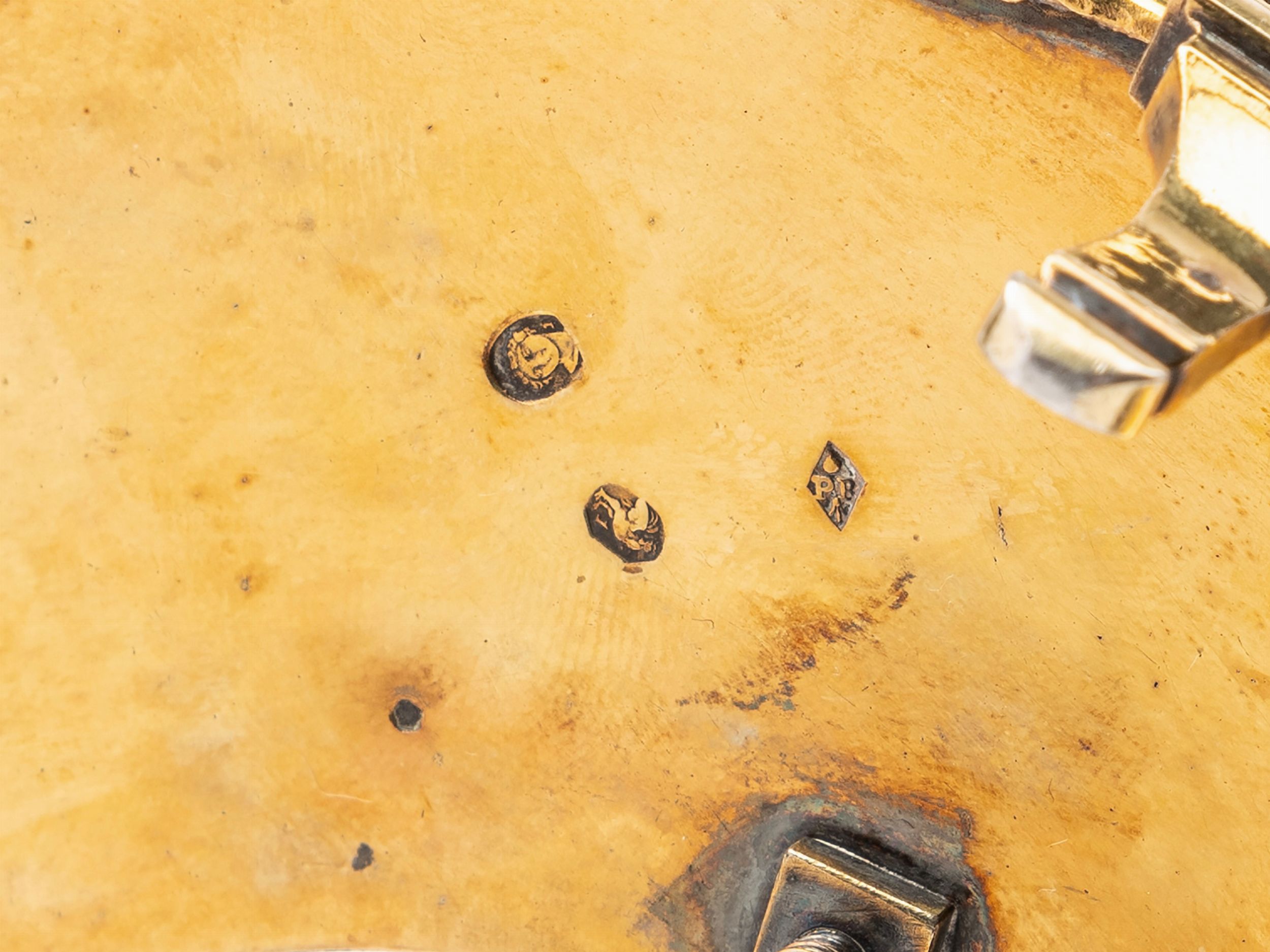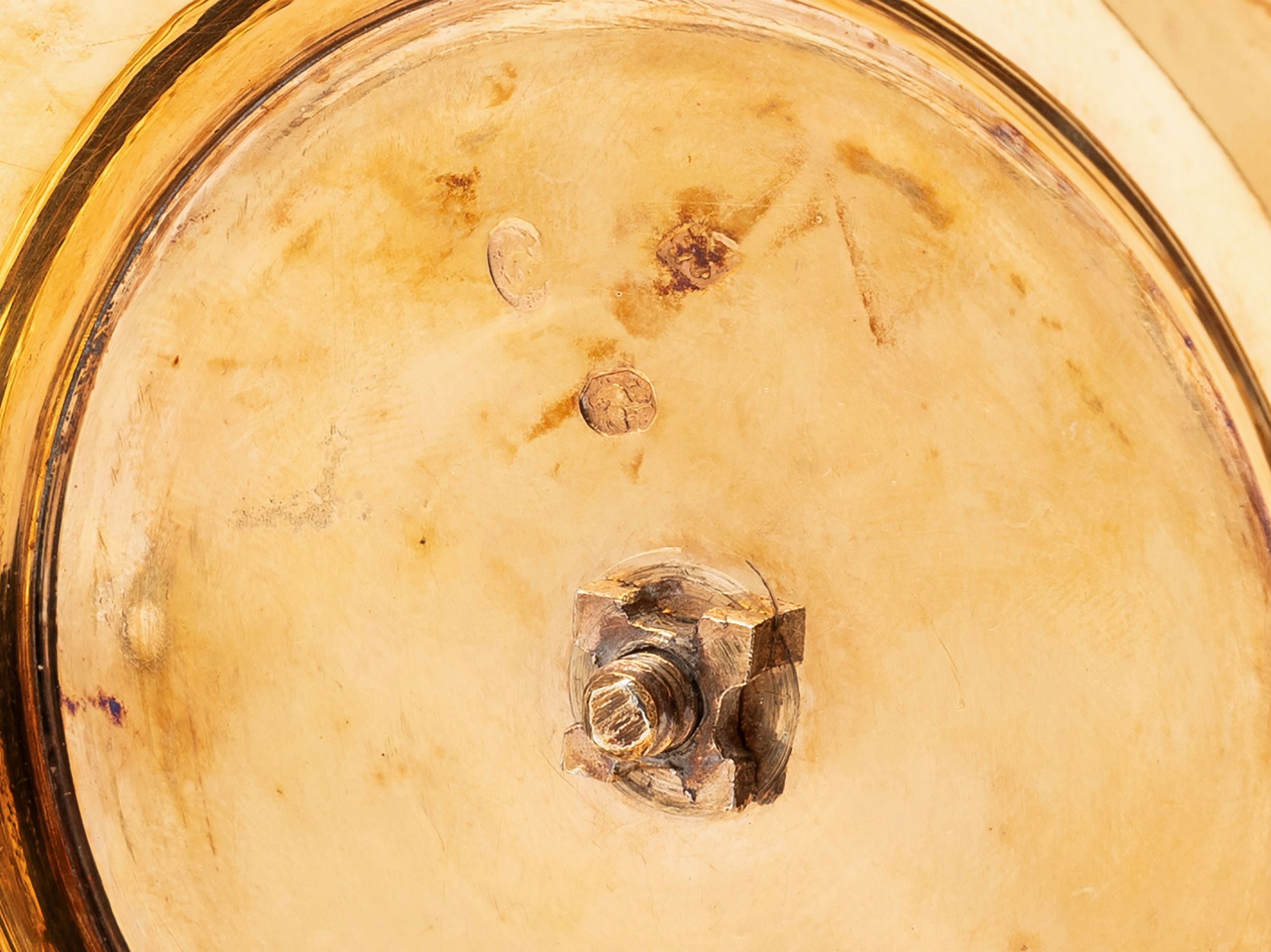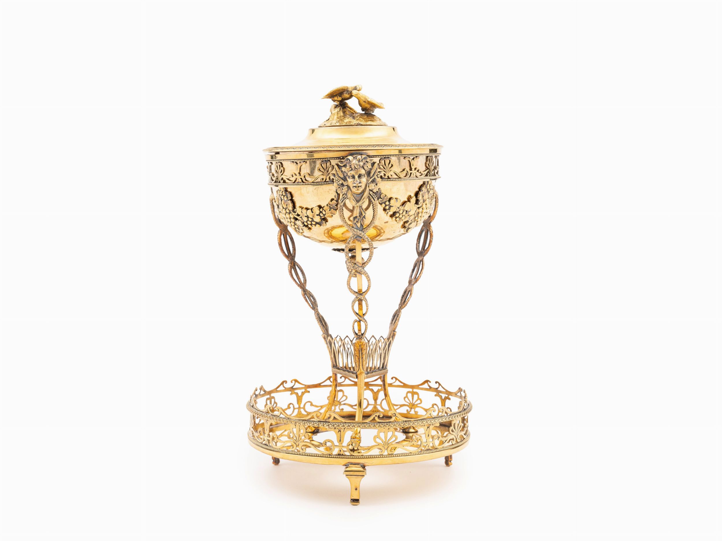 in argento vermeil, Peso kg 1,026 h cm 28,00 Parigi, fine XVIII secolo punzonata P.B. (Pierre Bourguignon), base circolare con ghiera traforata a volute, sostegno tripode terminante a zoccolo in forma di serpenti avviluppati sormontati da teste di satiri intervallate da ghirlande a tralci d'uva, coppa estraibile con terminale a pigna, presa del coperchio a coppia di colombe a tutto tondo.
