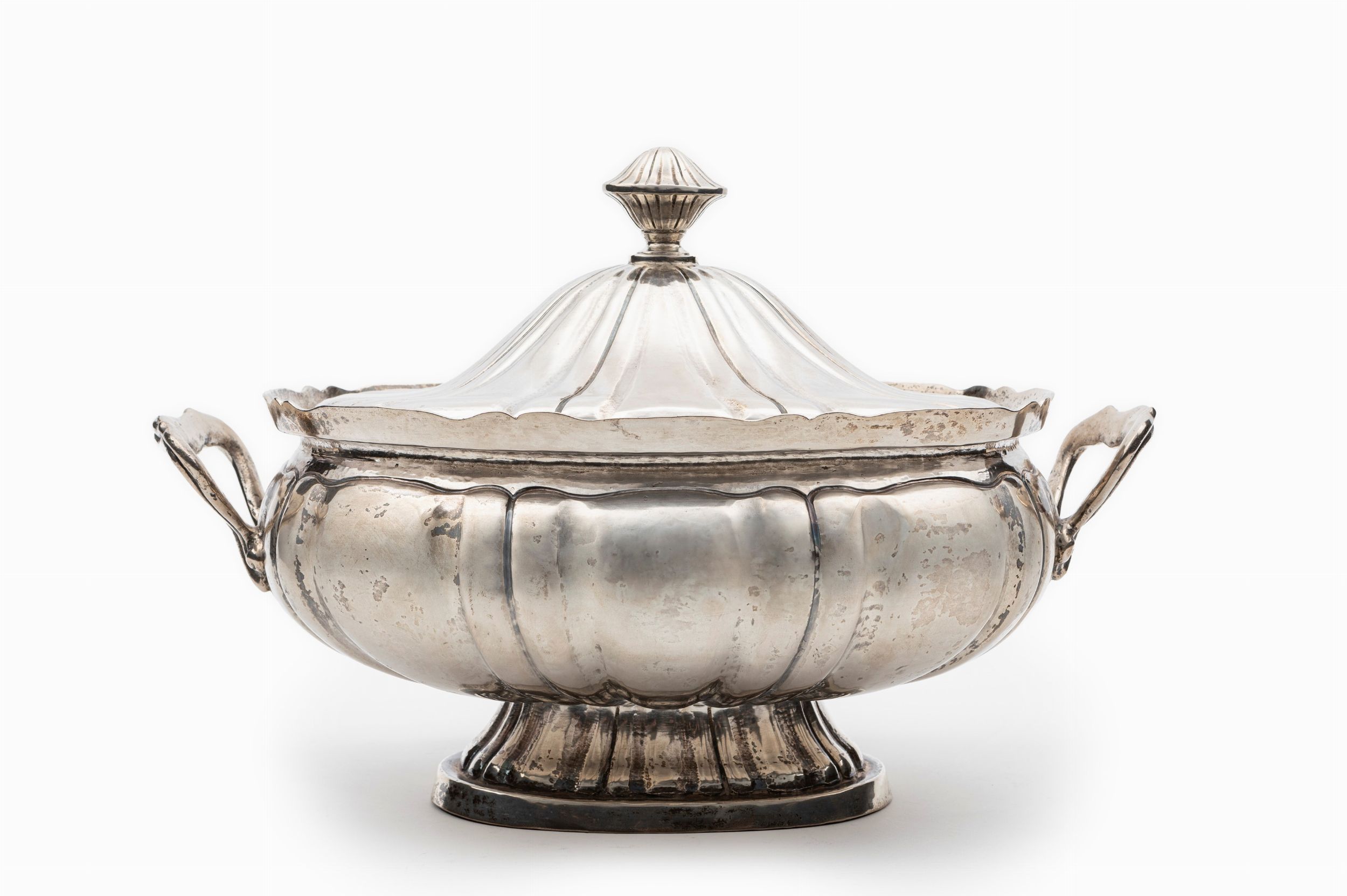 manifattura veneziana, XX secolo di forma ovale, a due manici, con decoro costolato.