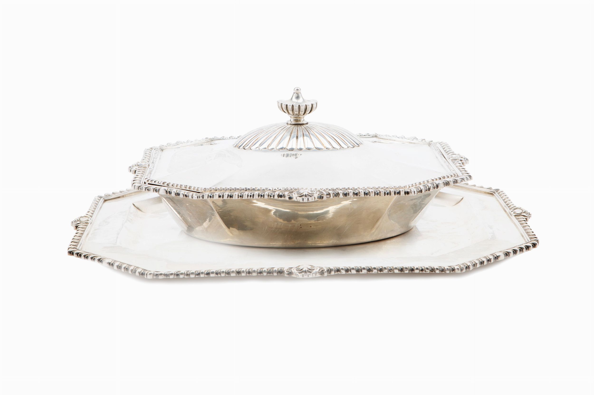 in argento, Peso kg 2,804 cm 24,30 la zuppiera, cm 32,00x40,00 il vassoio