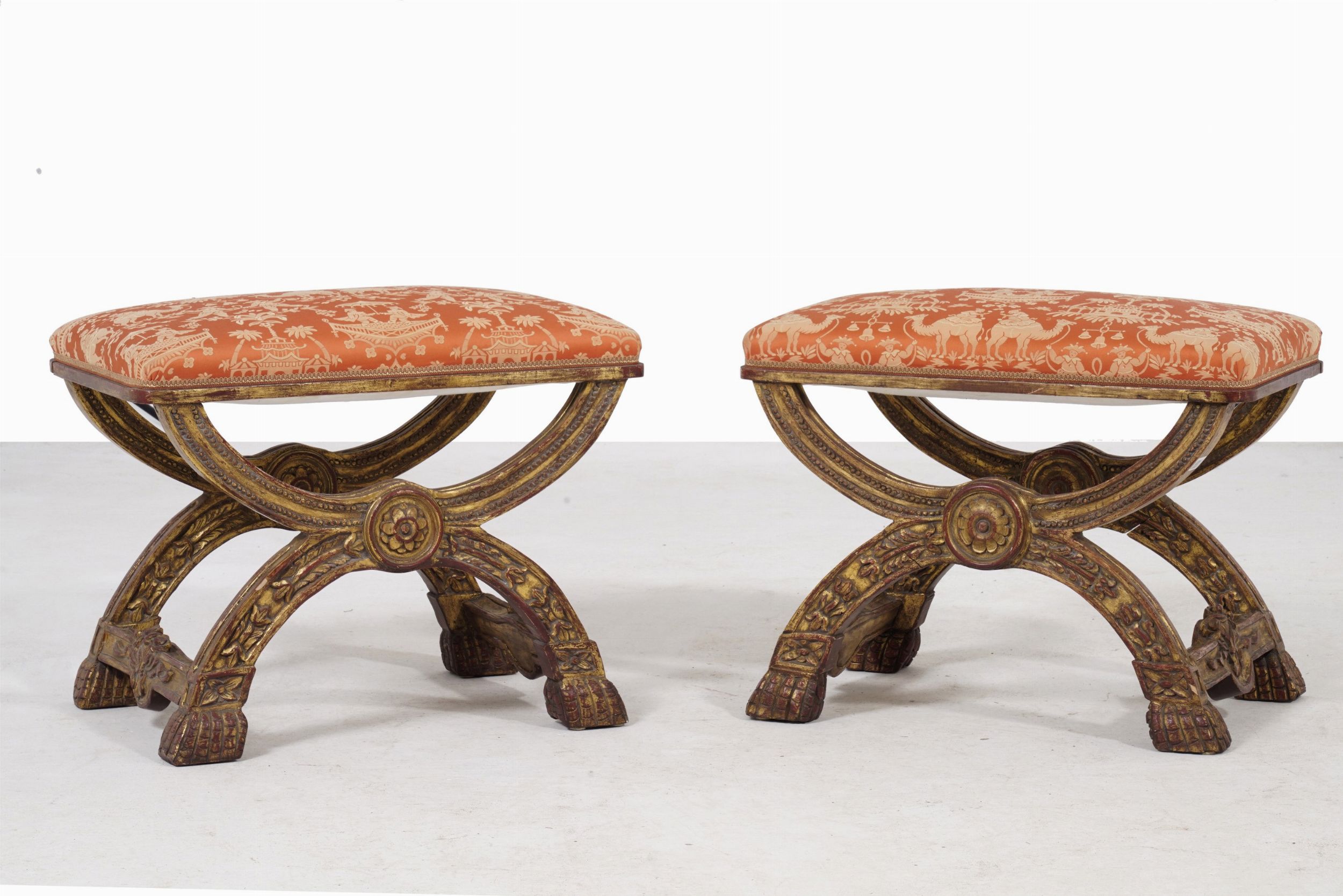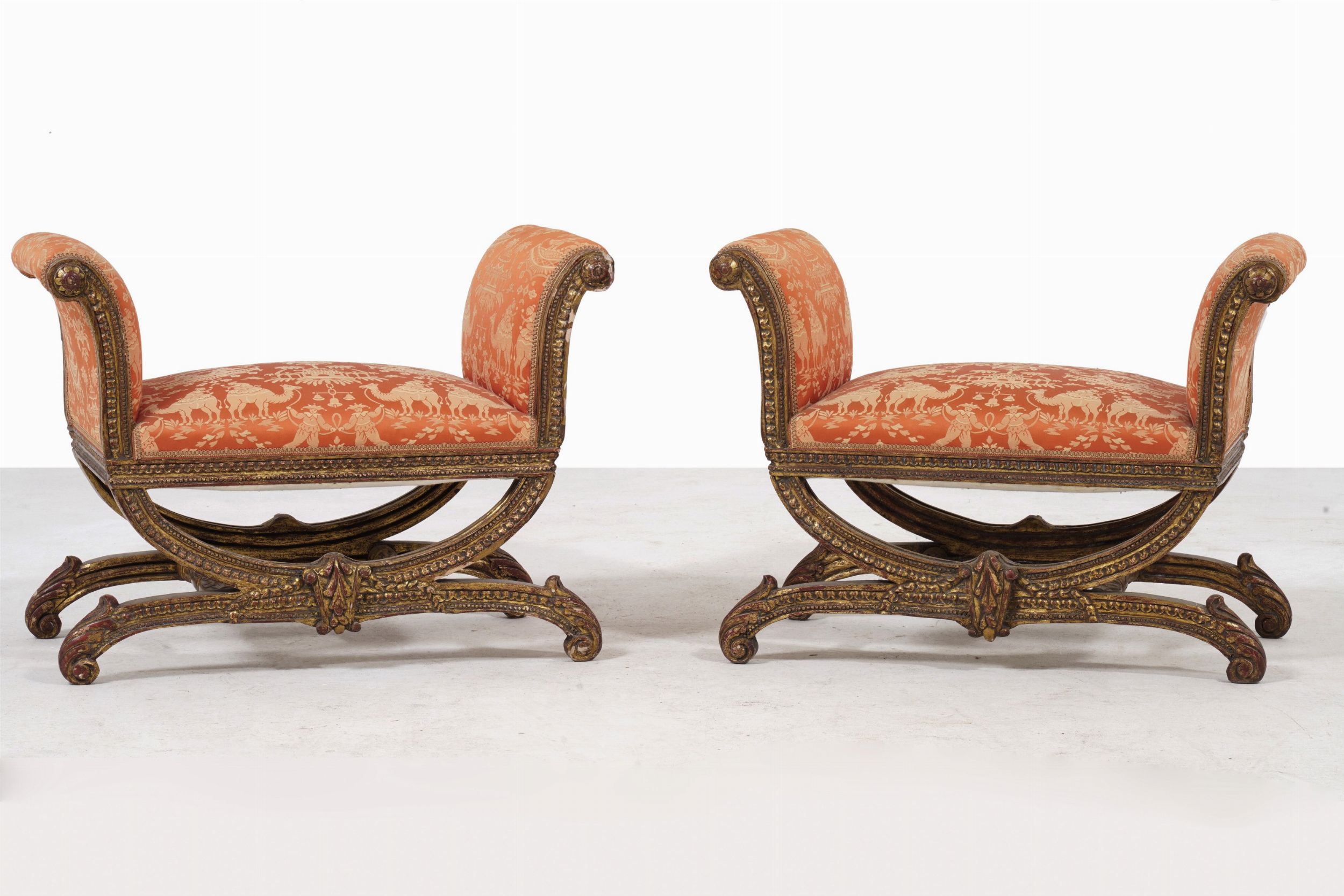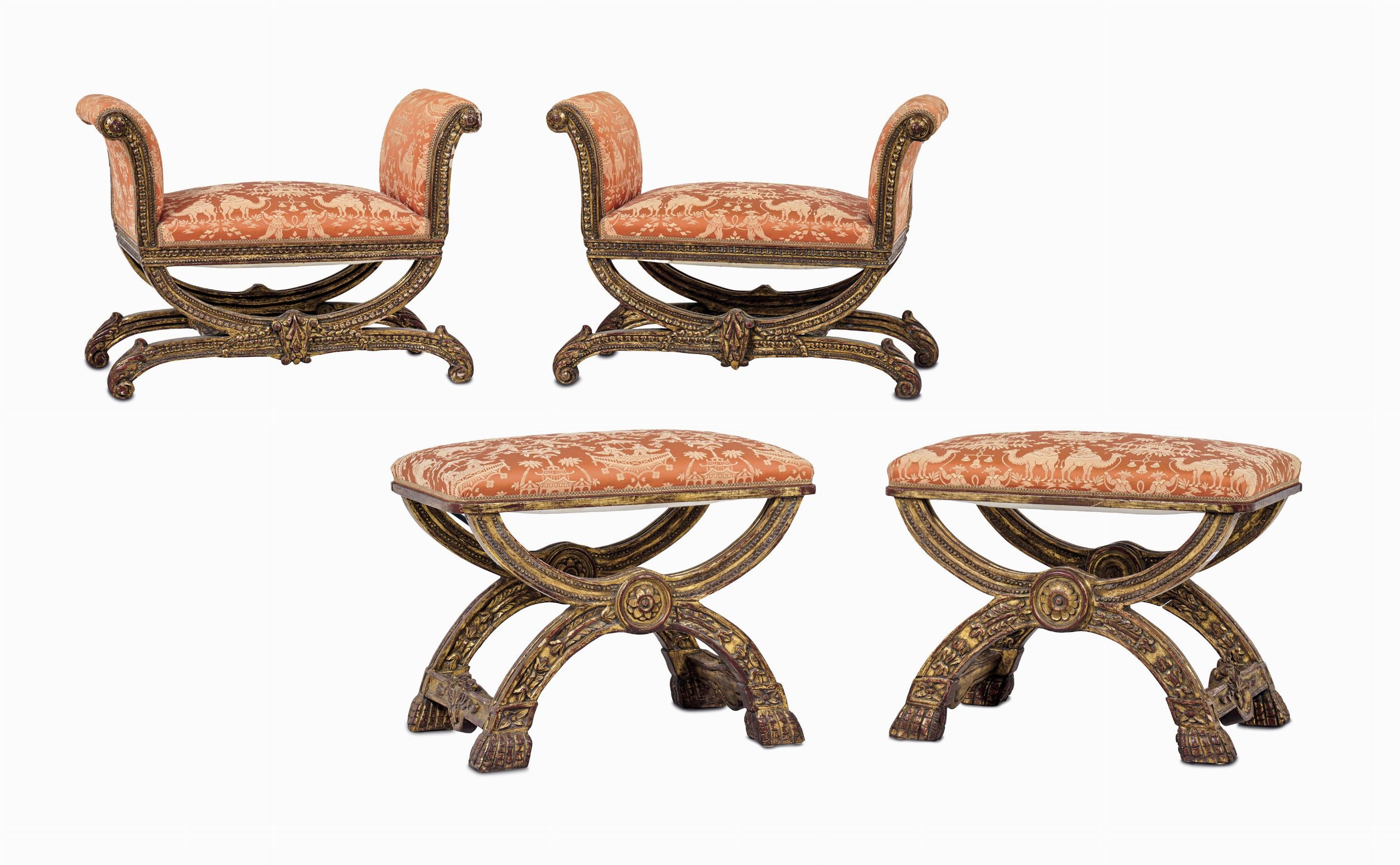 Coppia di faldistori e coppia di panchetti. XIX secolo