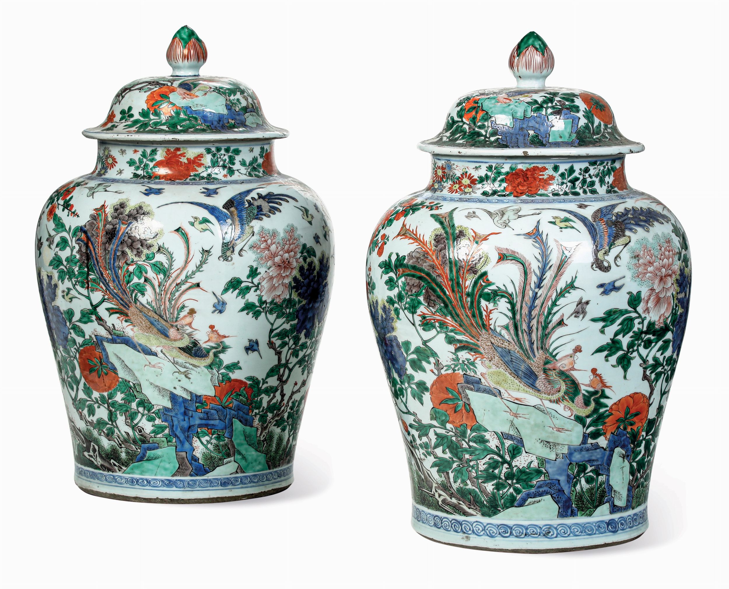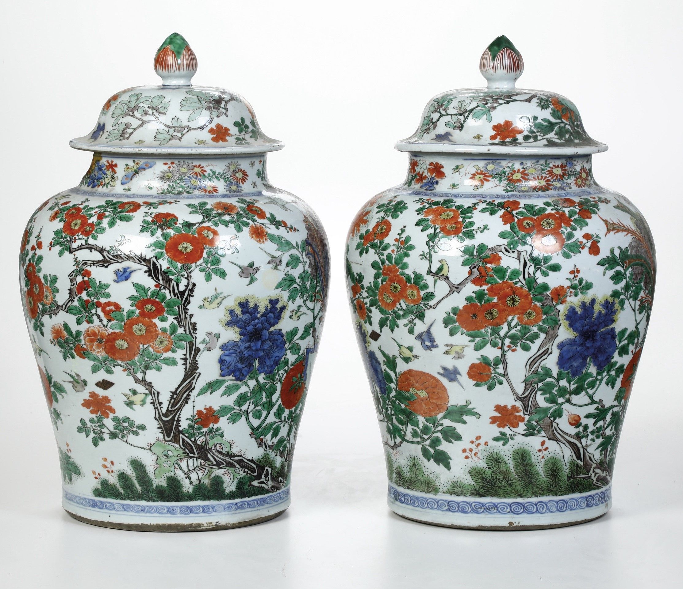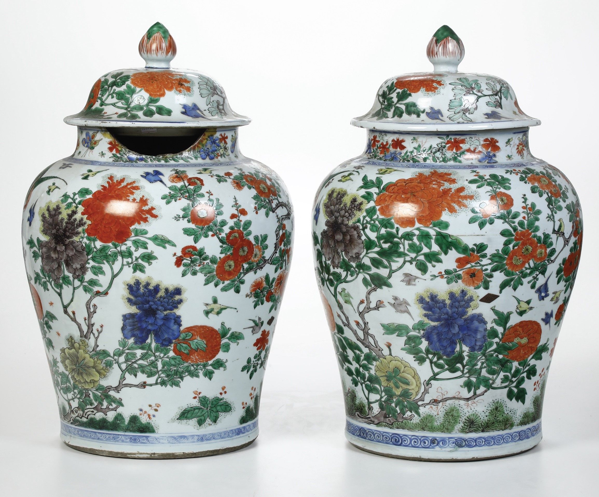 Coppia di importanti e grandi potiches in porcellana raffigurante paesaggio con [..]