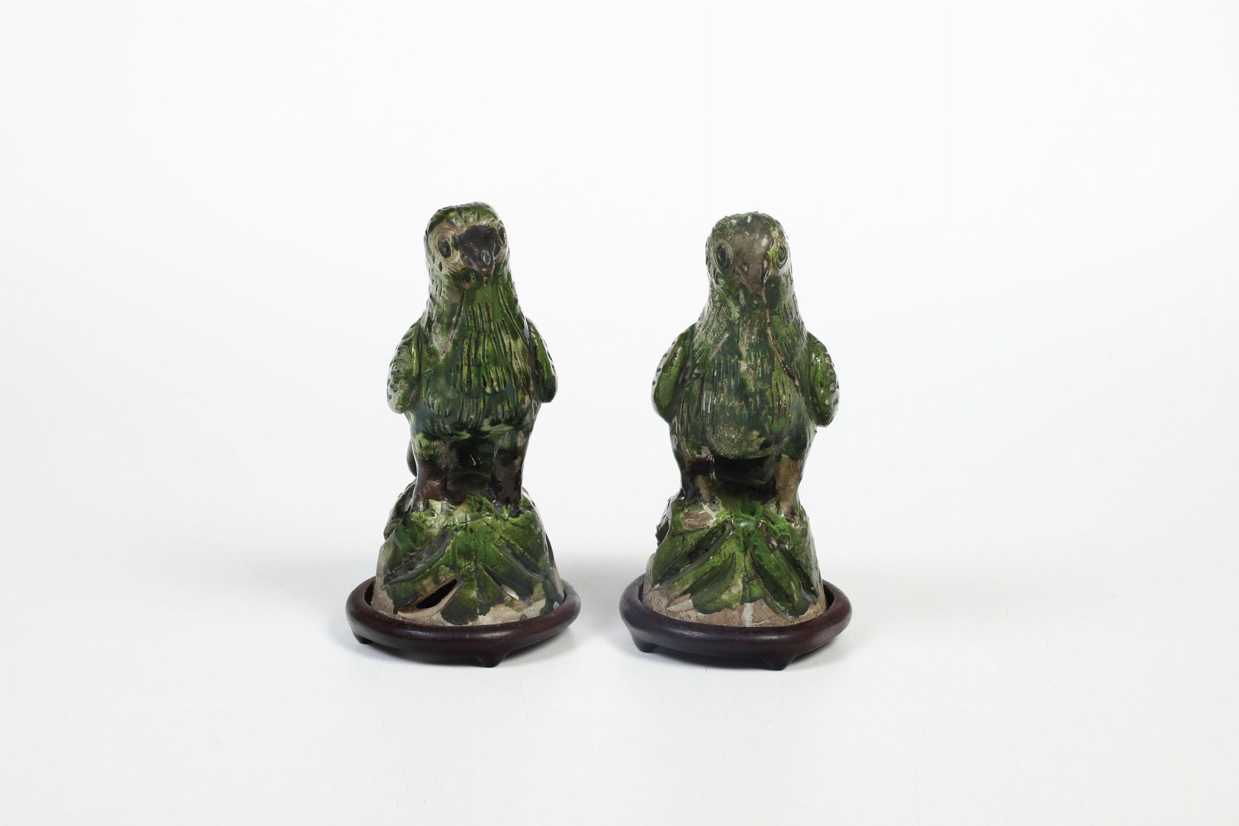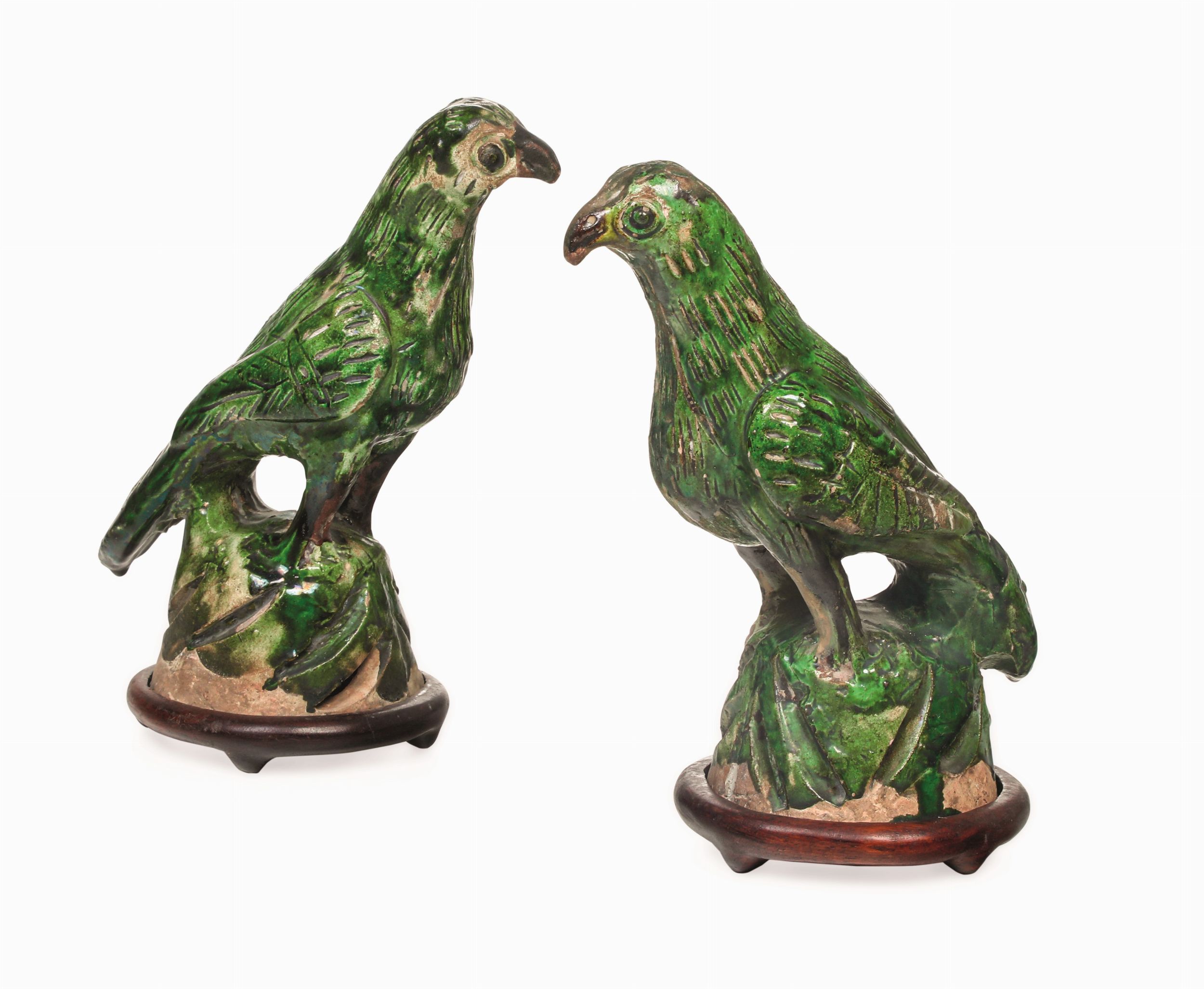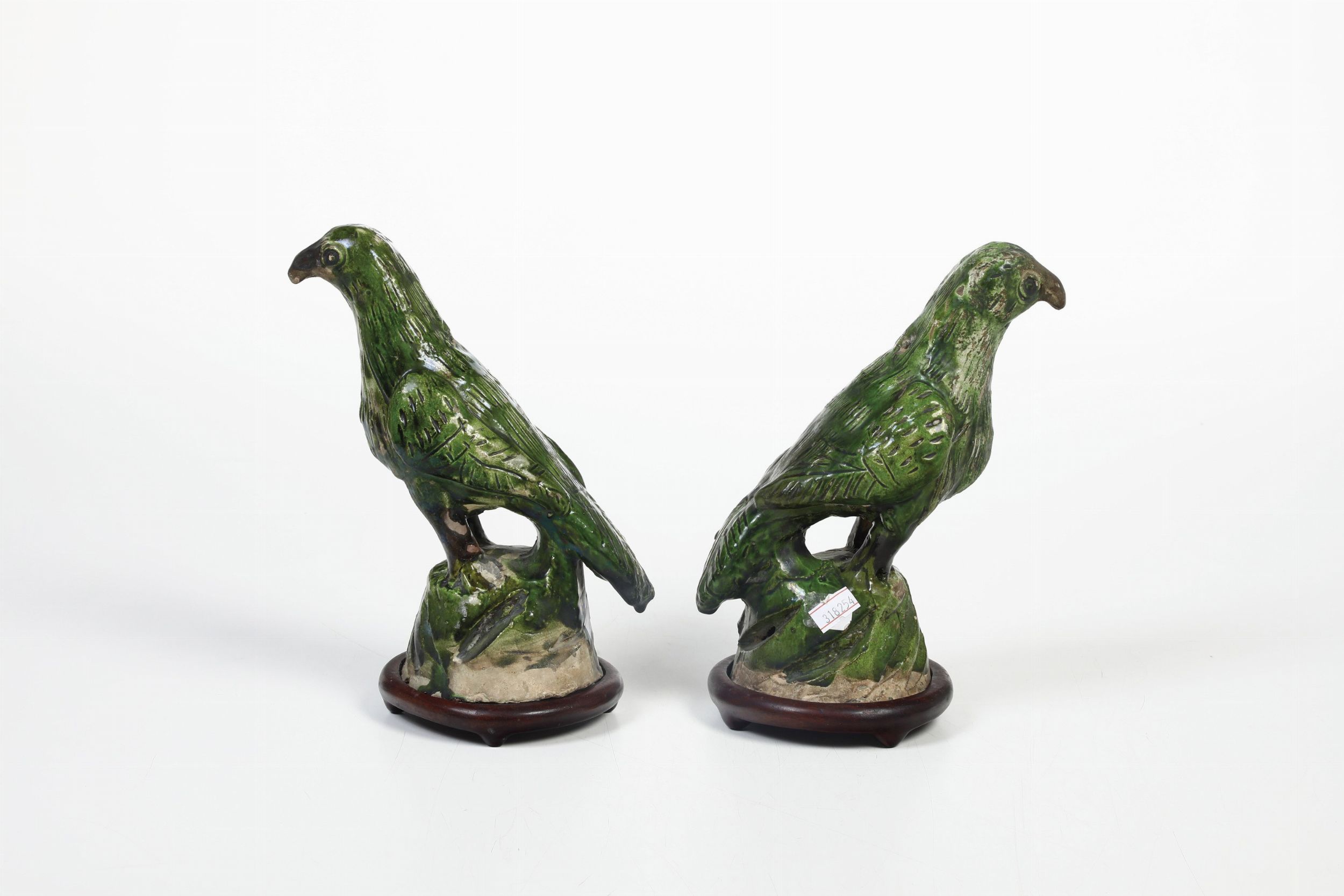 Coppia di pappagalli a fondo verde in porcellana, Cina, XVIII secolo