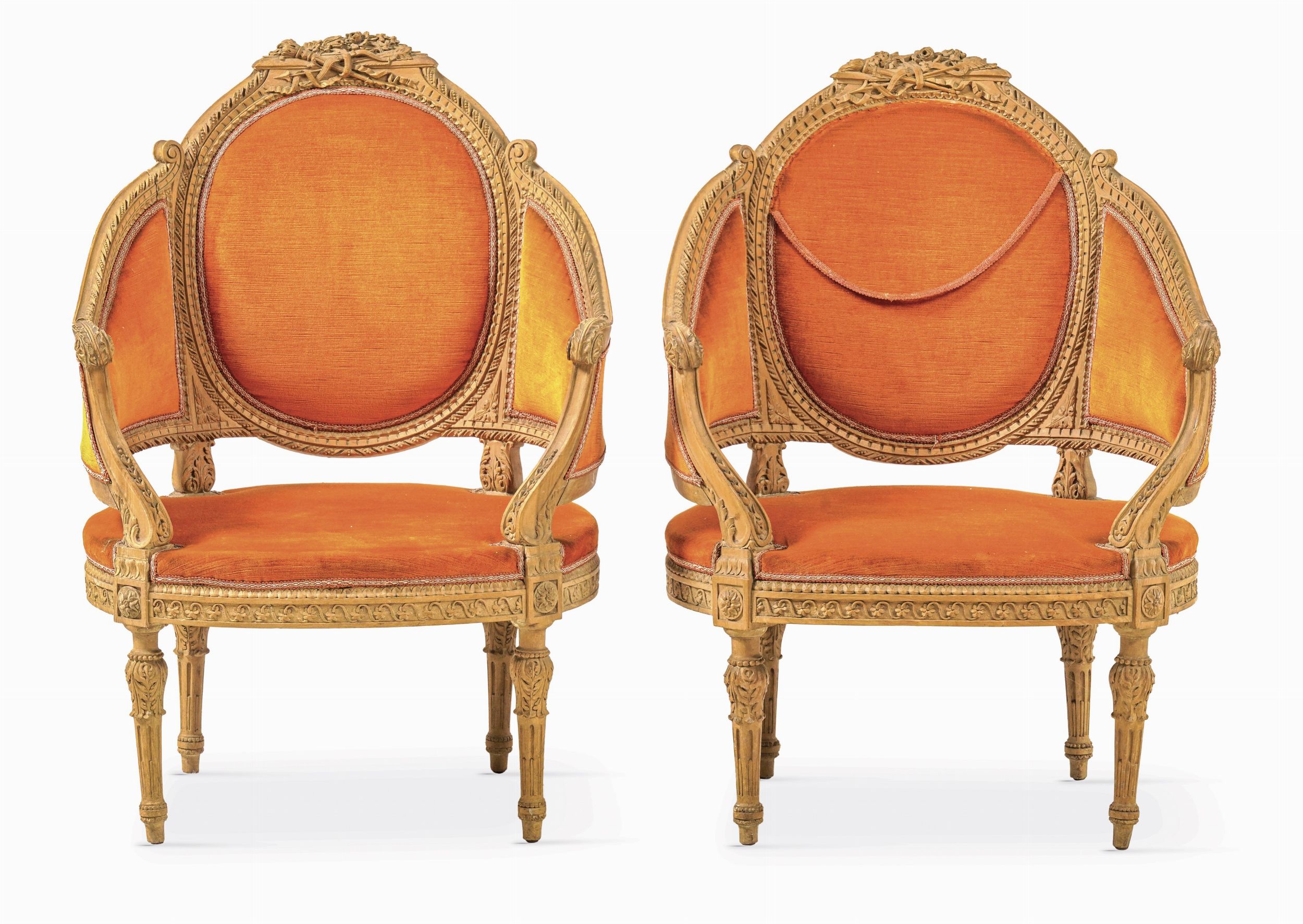 Coppia di poltrone a pozzetto in legno intagliato. XX secolo