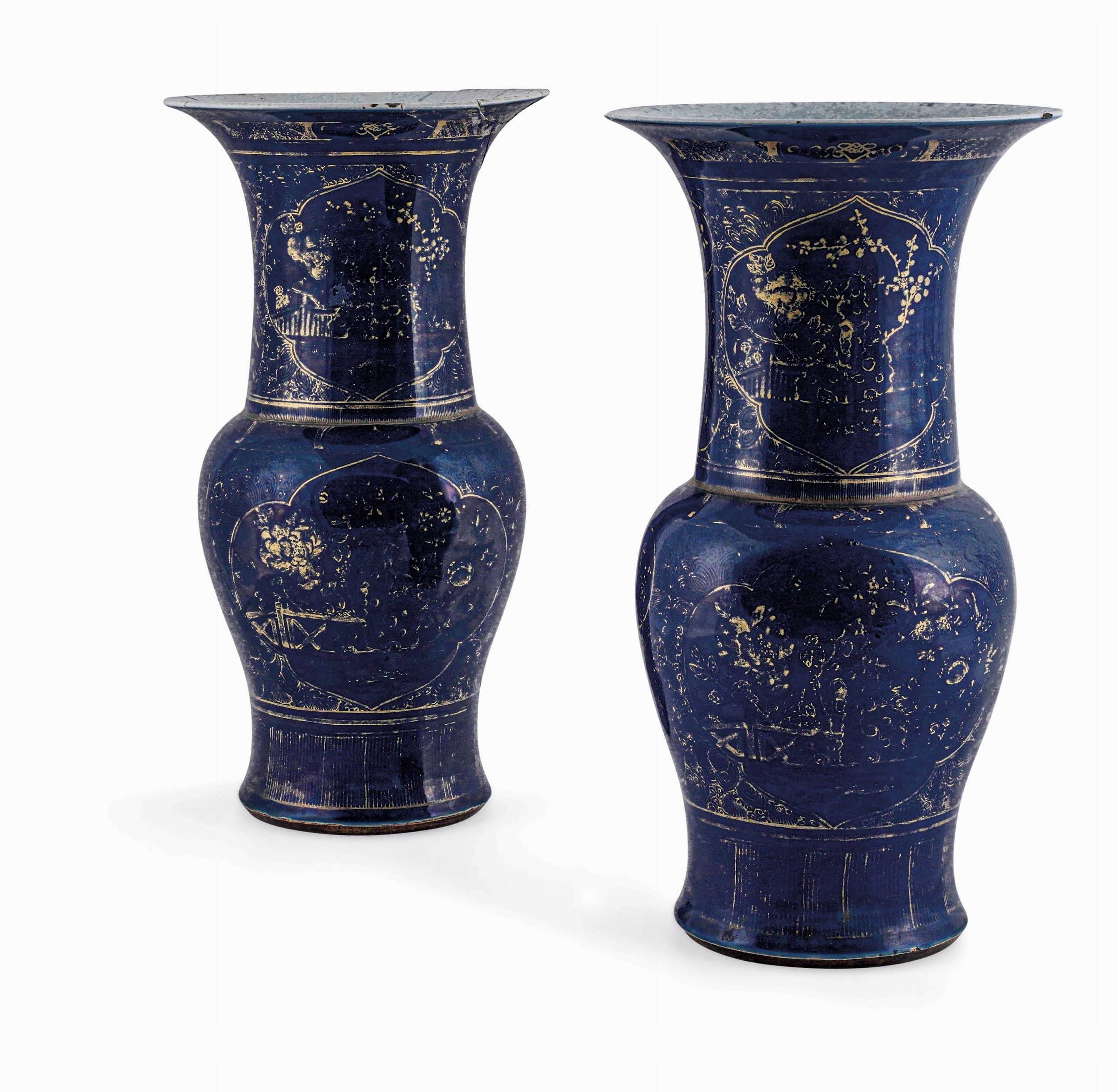 Coppia di vasi in porcellana monocroma blu poudrč con decoro in oro a soggetto naturalistico, [..]