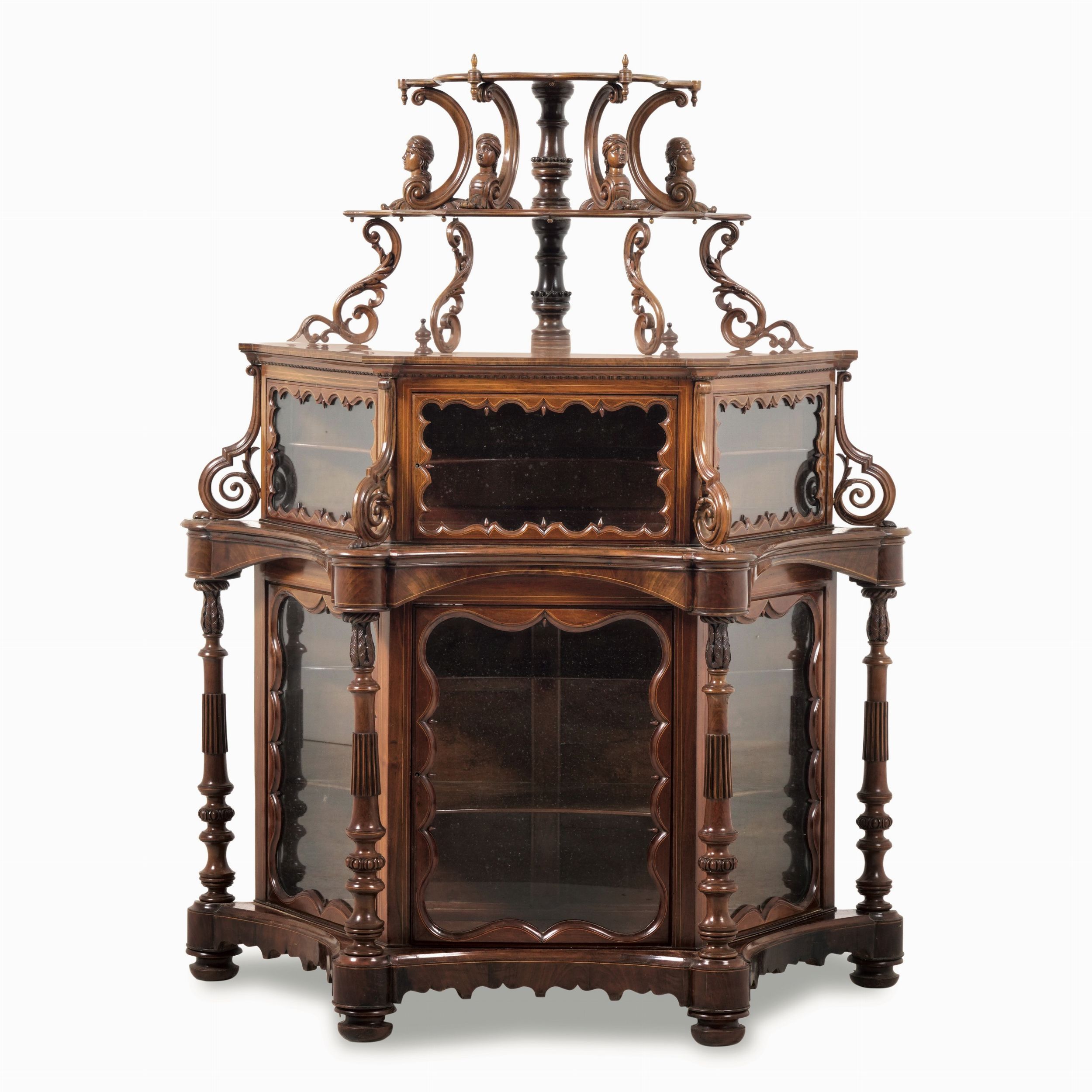 Etagere Luigi Filippo intagliato, intarsiato e filettato. XIX secolo