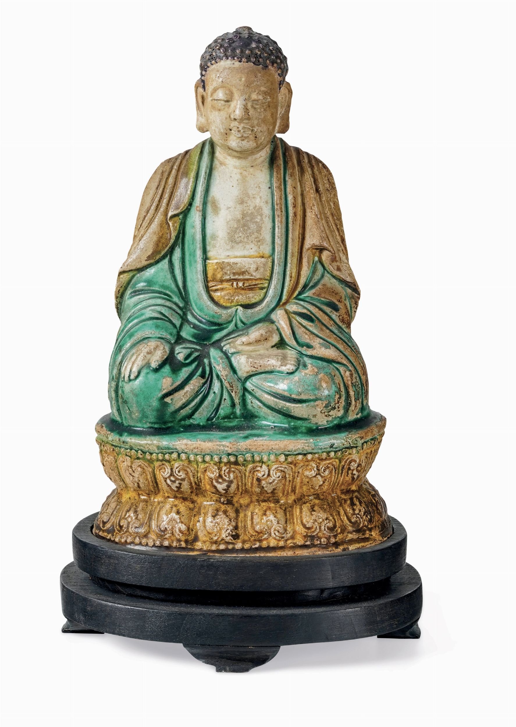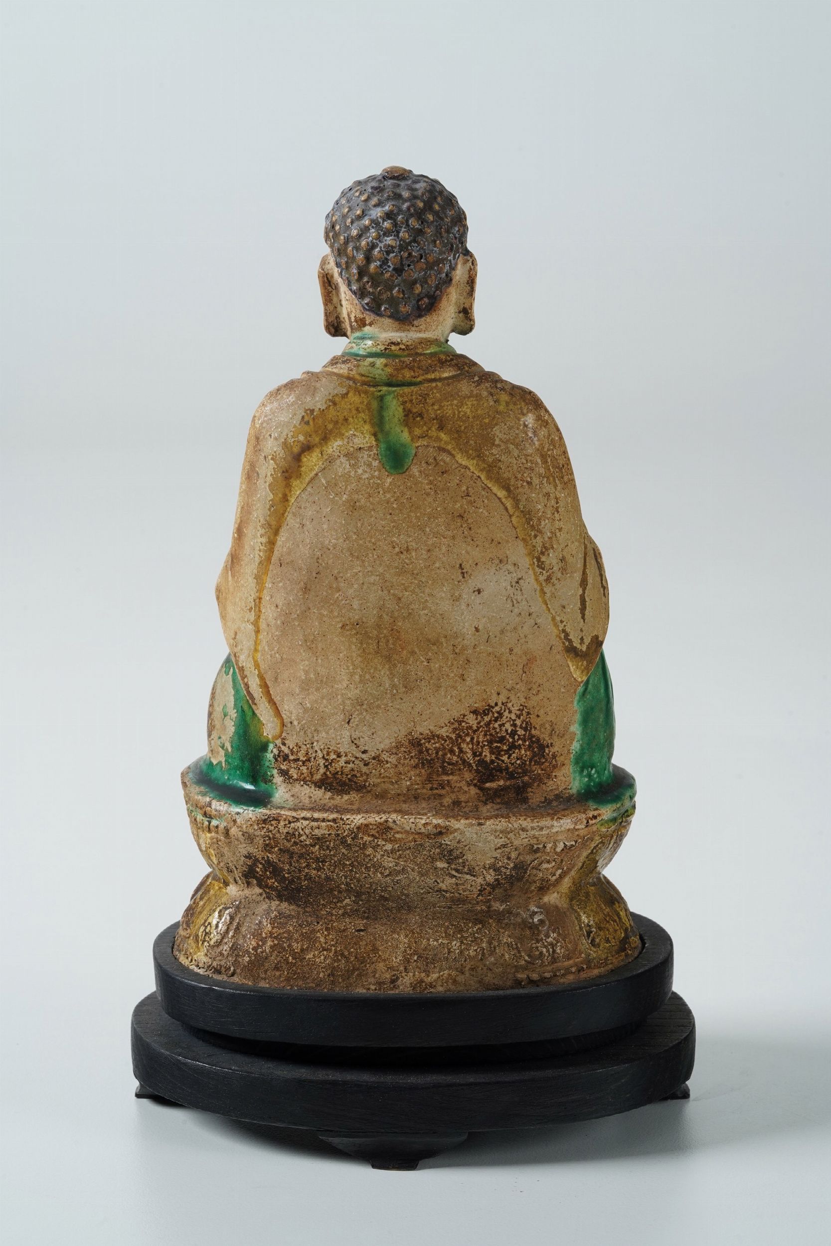 Figura in terracotta Sancai raffigurante monaco in preghiera seduto su doppio fiore [..]