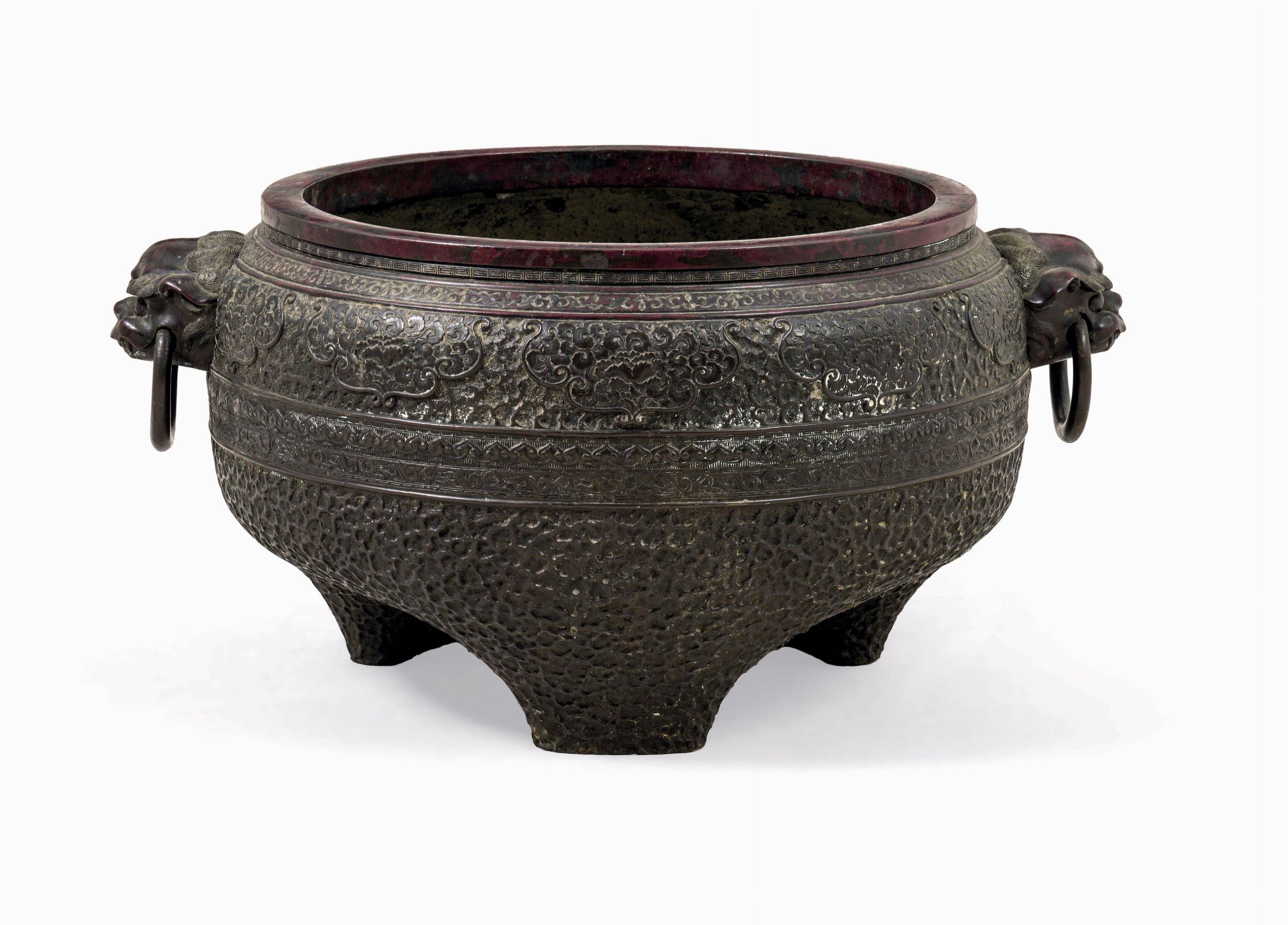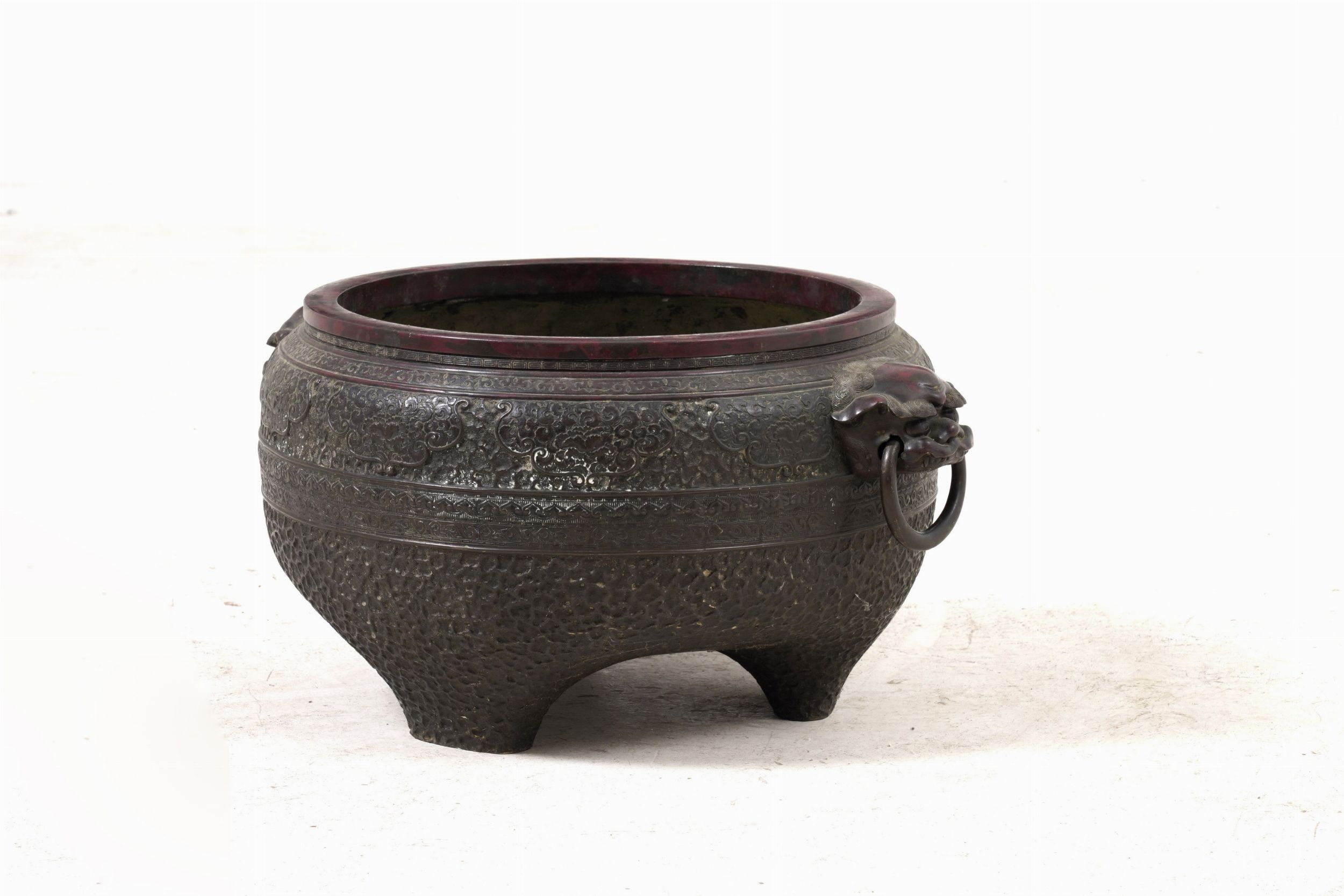 Grande incensiere in bronzo con motivi geometrici a rilievo e con anse a mascheroni [..]
