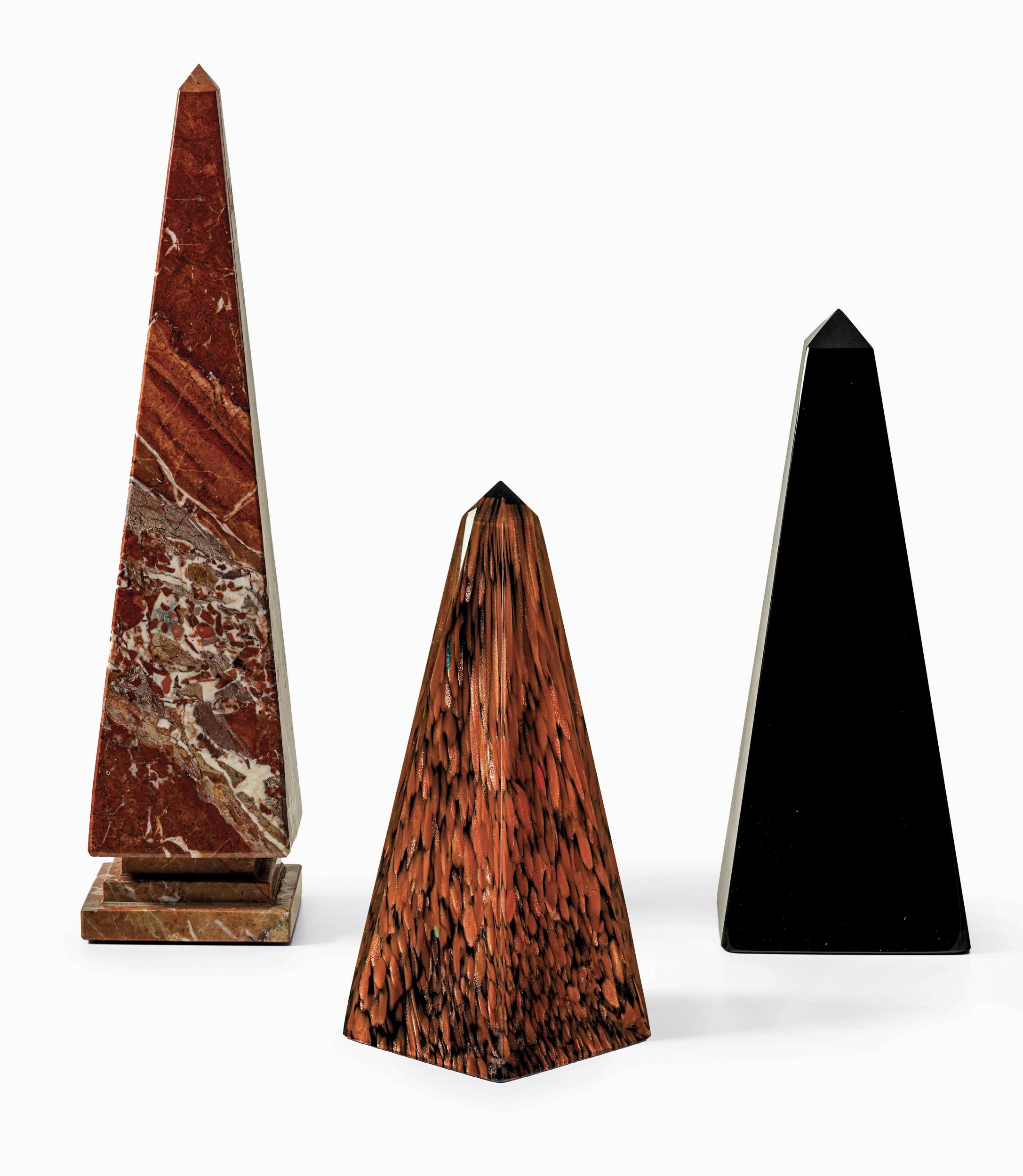 Insieme di tre obelischi in pietra dura e marmo. XX secolo