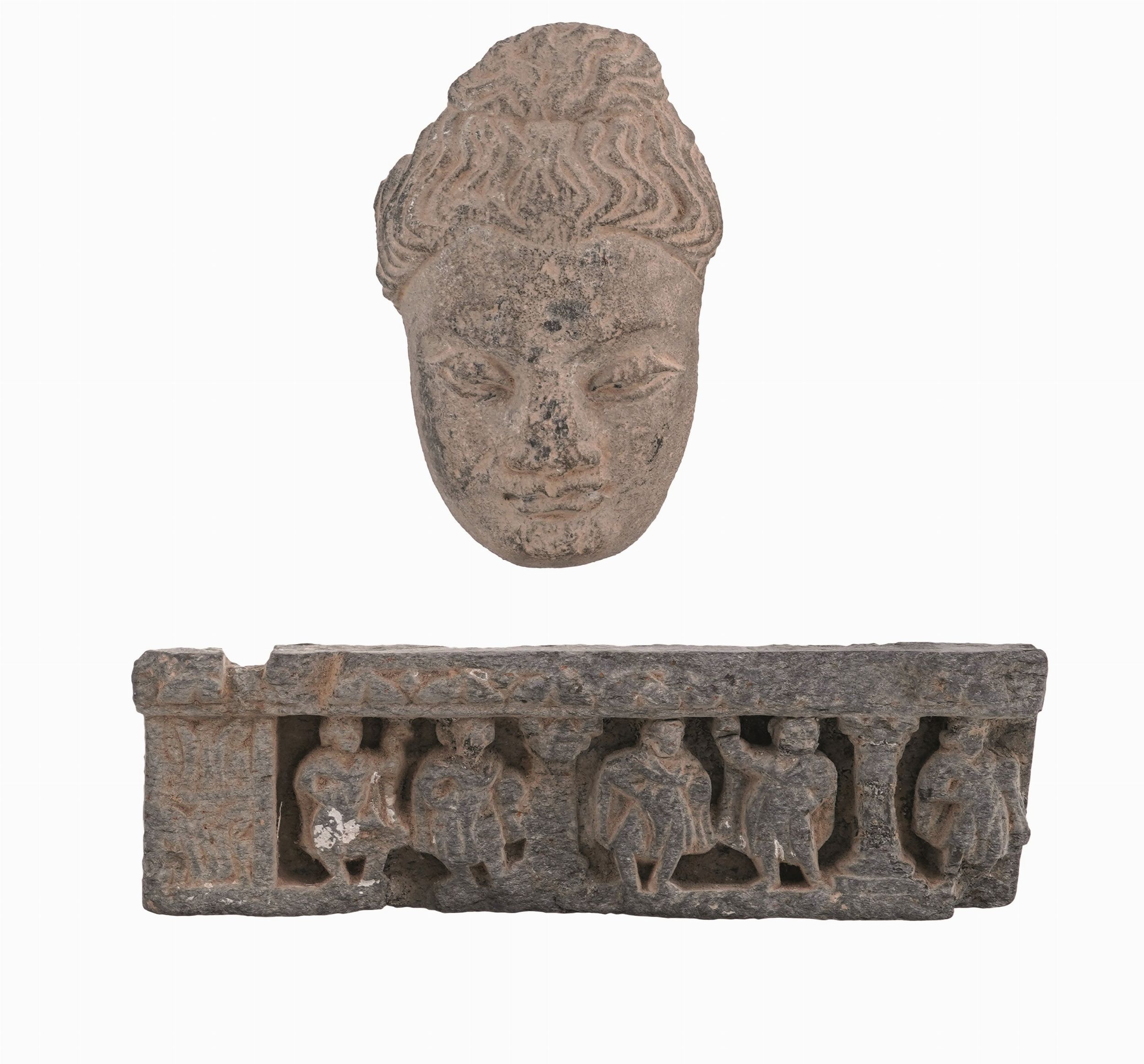 Lotto composto da fregio e testa di divinità scolpiti in pietra, Gandhara, II se [..]