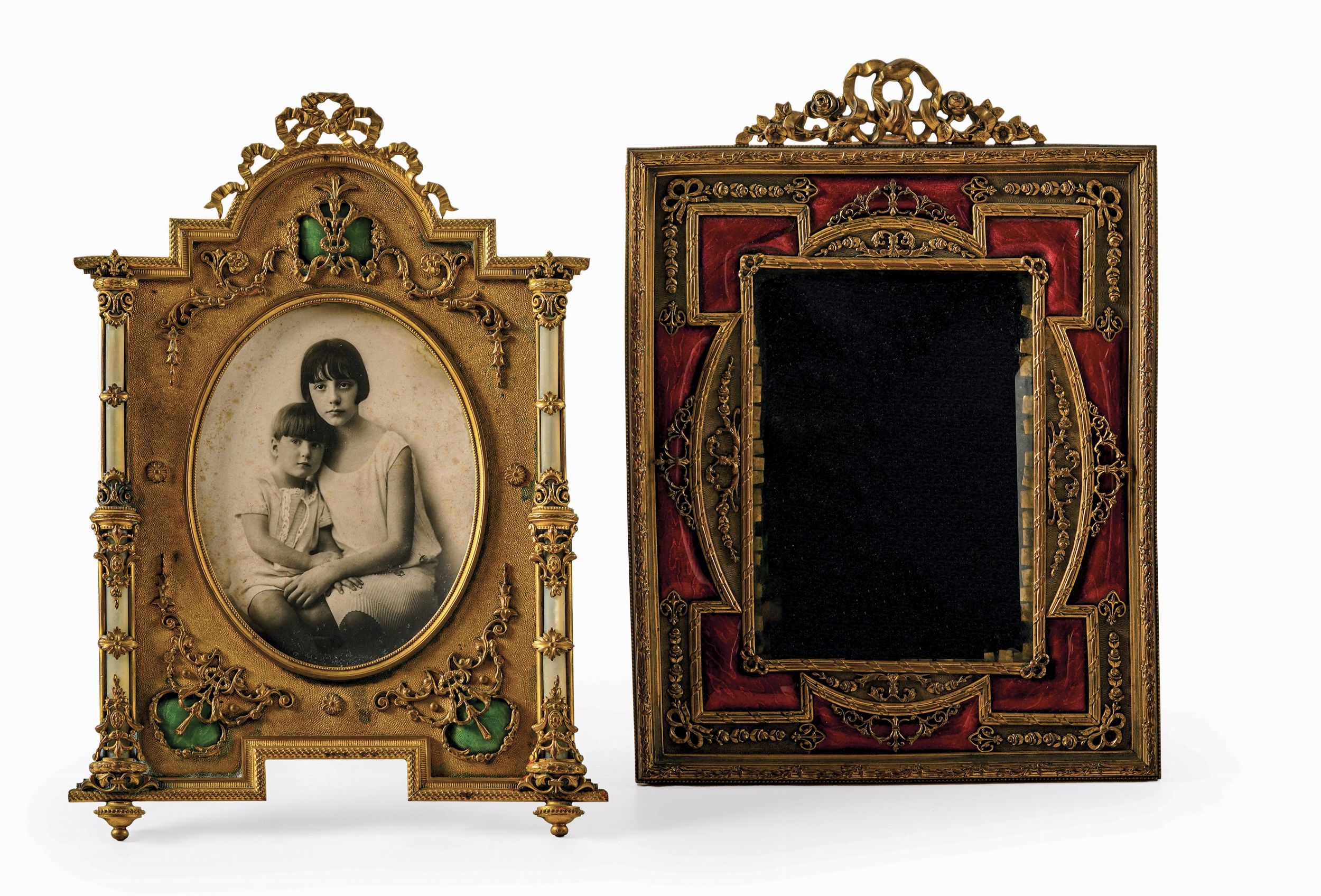 Lotto di due cornici porta ritratti in bronzo dorato e smalti. XIX secolo
