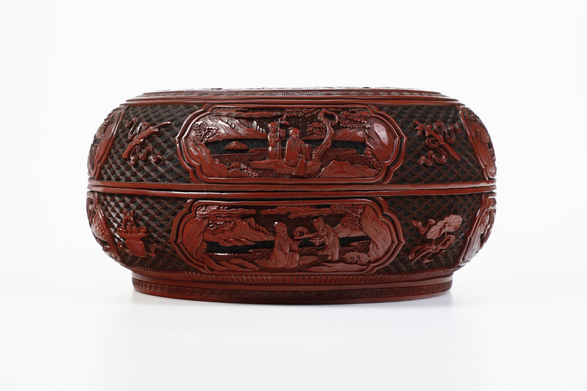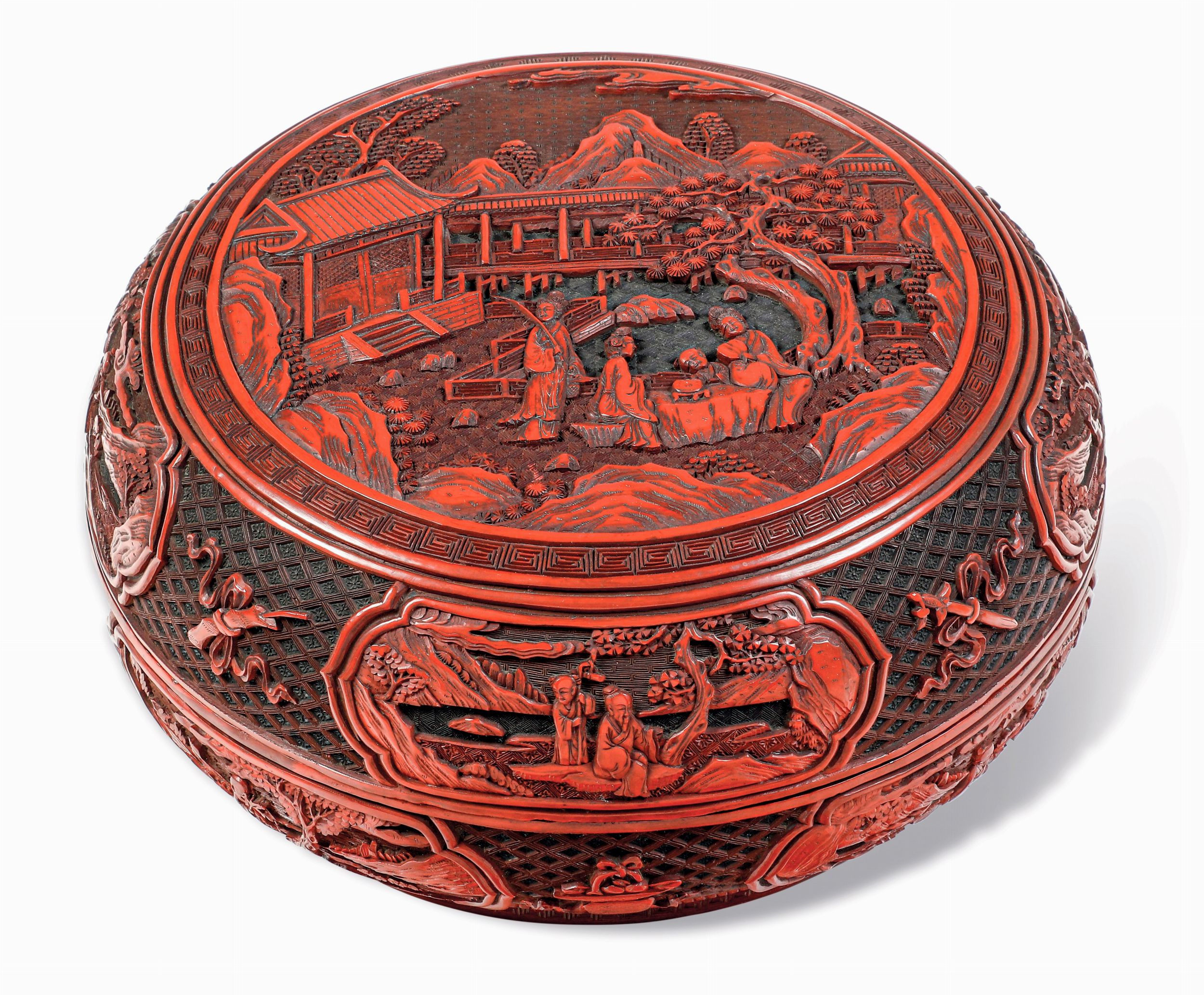 Scatola in legno laccato rosso raffigurante scena di corte, Cina, Dinastia Qing, [..]