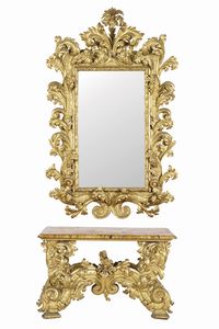 legno intagliato, laccato e dorato. Specchiere con cornice modanata scolpita e traforata a fregi vegetali, cimasa [..]