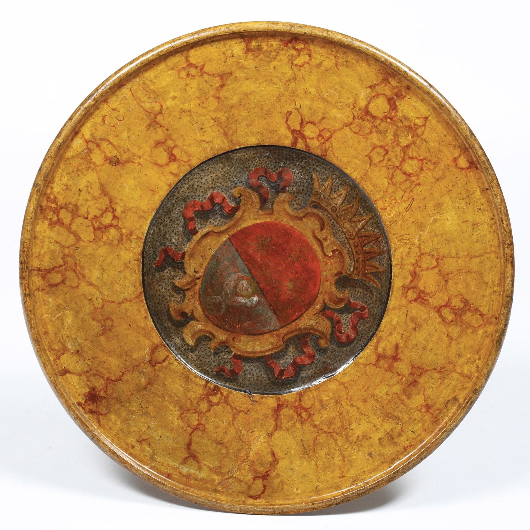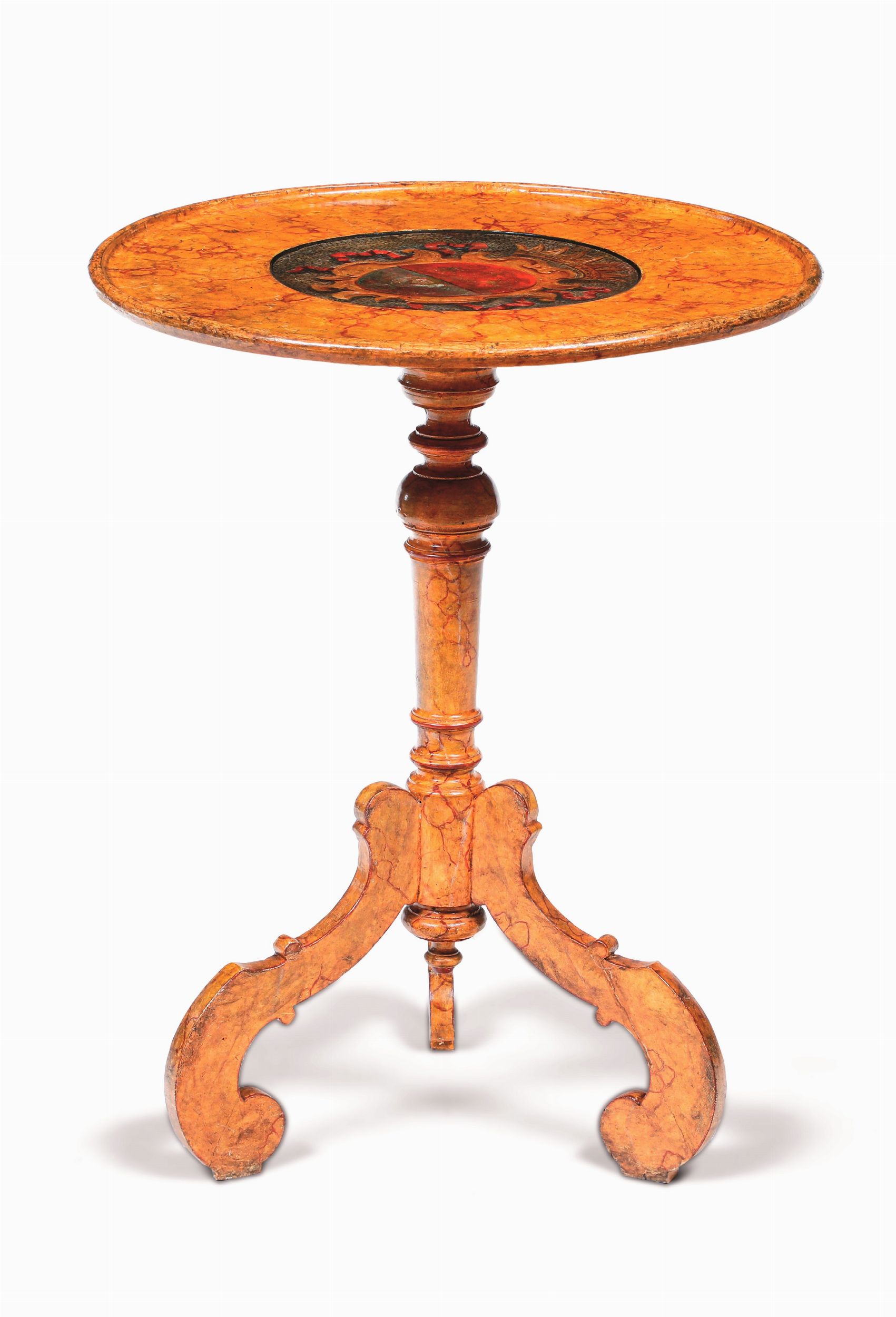 Tavolino in legno dipinto a finta radica con piano decorato da stemma in policromia. [..]