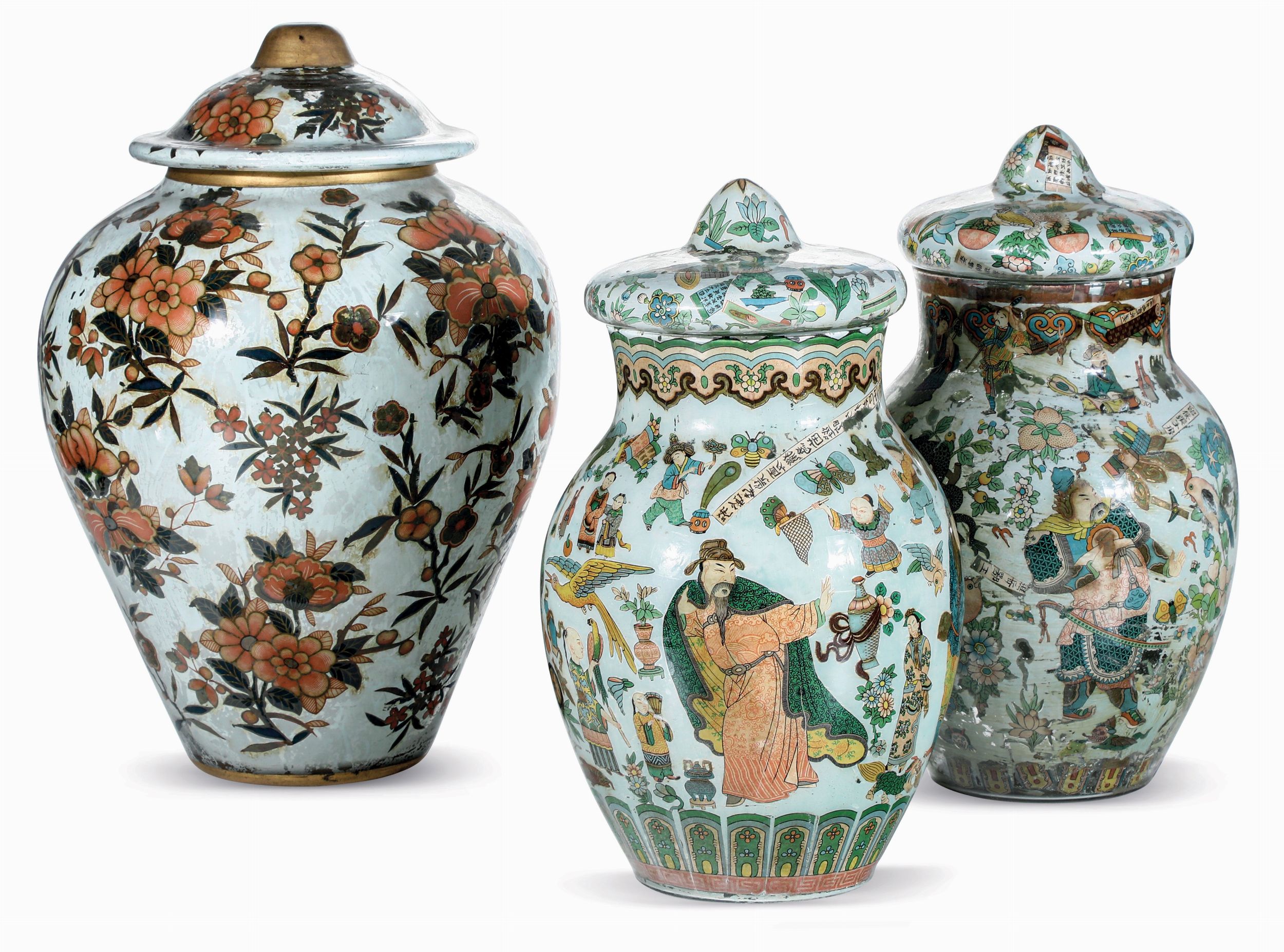 Tre potiches con coperchio in vetro soffiato decorato ad arte povera. Piemonte, [..]