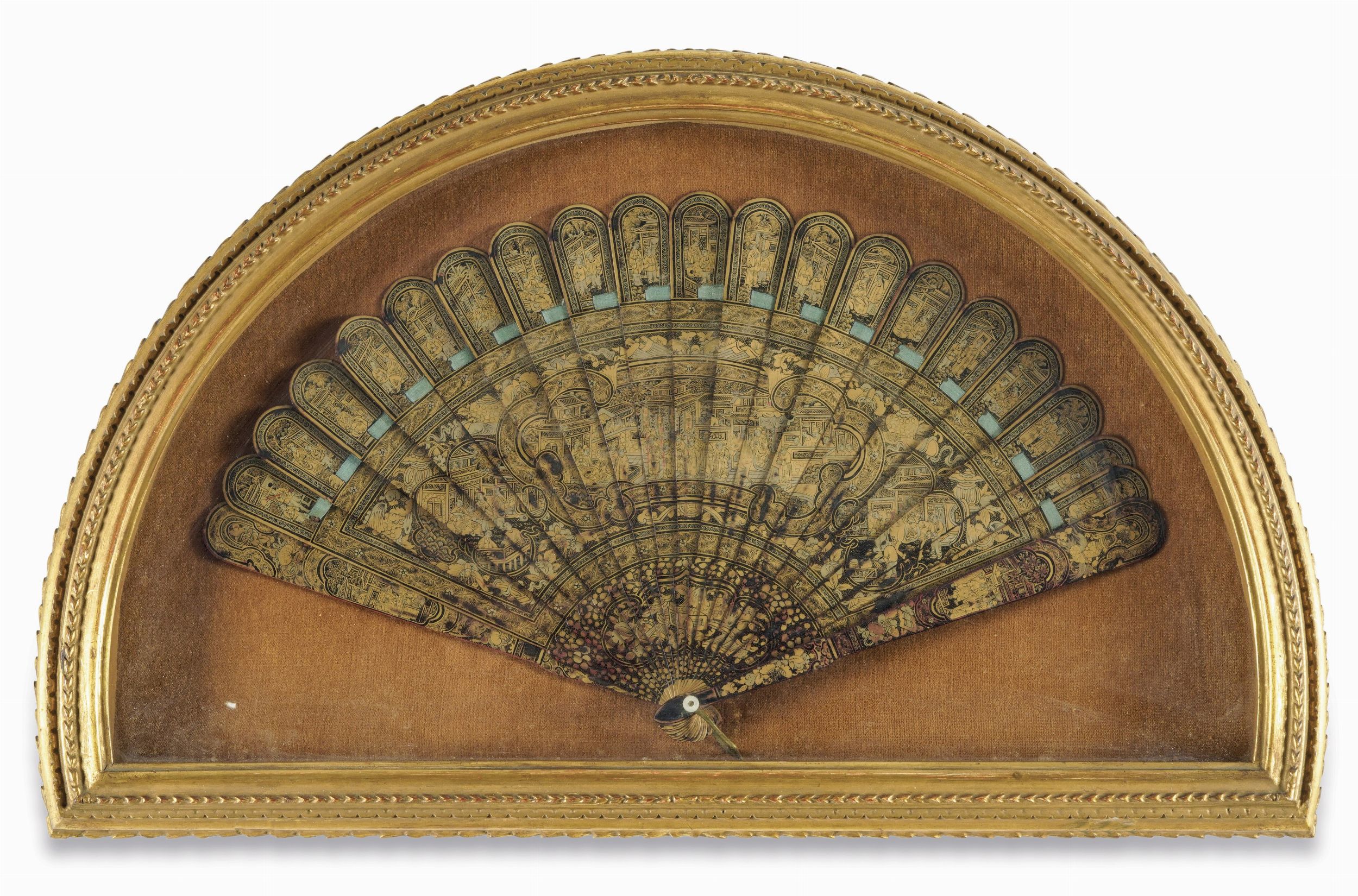 Ventaglio in lacca entro teca raffigurante paesaggio, Cina, XIX secolo